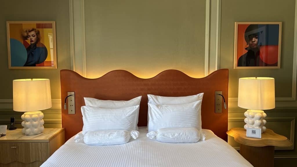 Besonders aufgefallen ist mir dabei die verspielte Optik mit verschiedenen Farben, die dem Zimmer viel Atmosphäre geben. Neben verschiedenen Bildern ist beispielsweise auch das Headboard des Bettes geschwungen geformt.