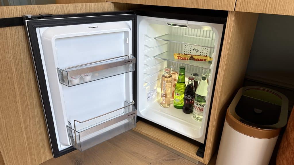 Zum anderen auch die Minibar, die sich ebenfalls unterhalb des Schreibtisches befindet. Diese ist nicht nur kostenfrei, sondern wird auch täglich aufgefüllt. Neben einer kleinen Süßigkeit und Chips gibt es hier auch ein paar Softdrinks, Bier und die lokale Spezialität Ice Tropez.