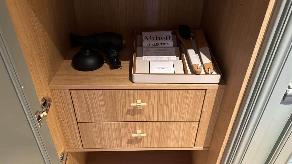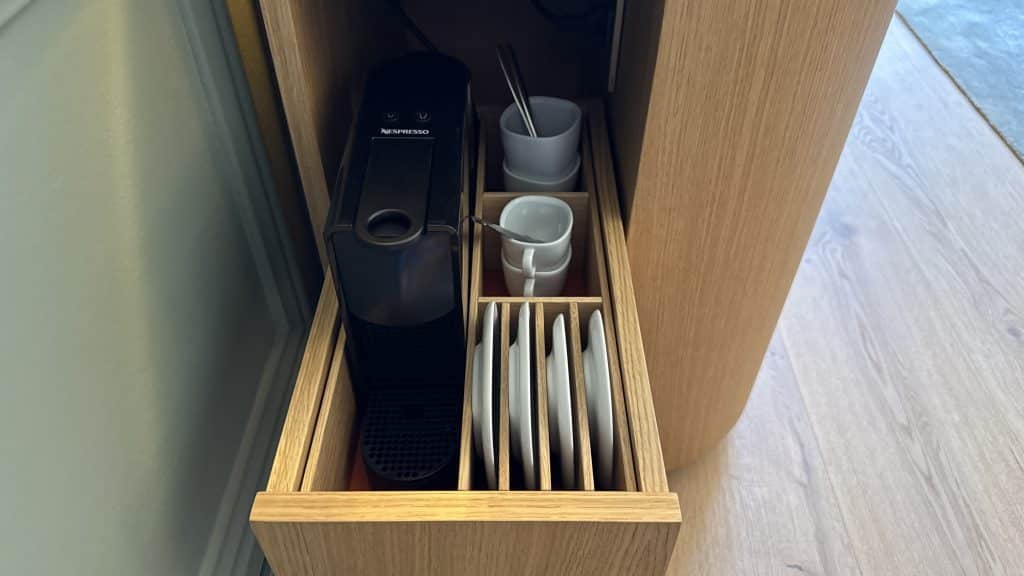 Positiv hervorheben will ich als Detail in meinem Althoff Villa Belrose Saint-Tropez Test noch zwei weitere Dinge. Zum einen die seitlich im Schreibtisch versteckte Nespresso-Kaffeemaschine, die mit dazugehörigem Geschirr und Kaffeekapseln kostenlos genutzt werden kann.