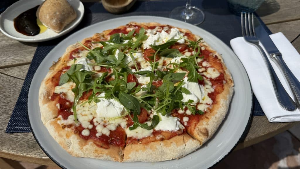 Das Preisniveau ist fraglos recht hoch, beginnen die meisten Gerichte doch bei etwa 25 Euro. Dafür kann aber auch die Qualität überzeugen, etwa bei der Pizza mit Burrata, die zu den günstigeren Gerichten auf der Karte gehört.