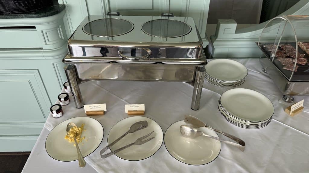 Doch auch wer lieber warm frühstückt, wird am Buffet fündig. So stehen dort unter anderem Rührei und verschiedene Beilagen bereit, an denen man sich bedienen kann.