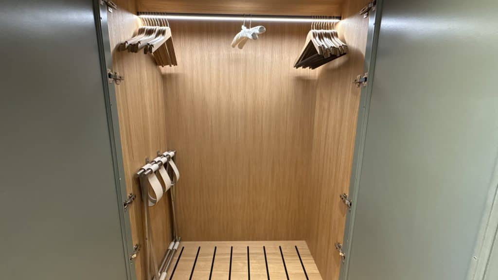 Daneben stehen einem zwei Schränke zur Verfügung, wobei einer primär Hängefläche und darunter Platz für einen Koffer bietet.