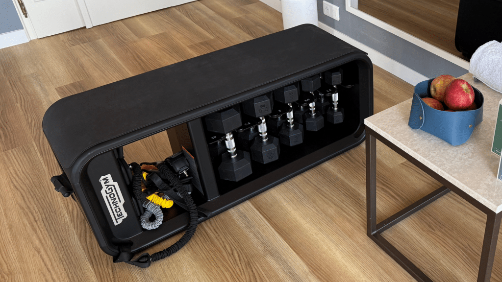 So gibt es nur einen Stepper, ein Laufbad, ein Fahrrad, ein Kinesis-Gerät, ein paar Bälle, Yogamatten sowie eine TechnoGym-Bench mit einigen Gewichten.