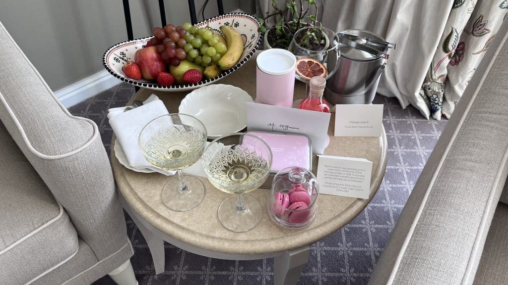 Das Zimmer verfügt neben dem Kingsize-Bett auch über zwei Sessel und einen kleinen Tisch, auf dem sowohl zur Anreise als auch immer wieder zwischendurch während des Aufenthalts kleine Aufmerksamkeiten bereitgestellt wurden.