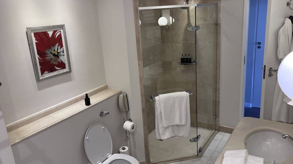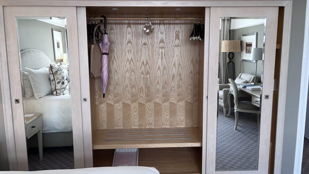 Der Schrank bietet reichlich Ablagefläche und auch eine gute Anzahl an Hängern. Darüber hinaus ist ein Safe sowie ein Fön, allerdings kein Bügeleisen zu finden. Für mich persönlich, der auch geschäftlich viel reist, ist ein Bügeleisen in Hotels jeder Klasse wichtig. Selbstverständlich schätze ich auch den Wäscheservice, der angeboten wird, aber bei nur wenig Zeit oder kurzfristigen Entscheidungen zur Wahl des Dresses, ist es für mich einfach beruhigend, selbst schnell Hand anlegen zu können. Auf Nachfrage direkt nach Ankunft wurde dies umgehend ins Zimmer geliefert, sodass es hier keinen wirklichen Minuspunkt zu vergeben gibt.