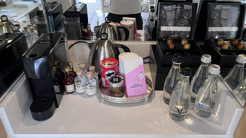 Weiterhin findet man im Wandschrank versteckt die Minibar sowie eine Nespresso Kaffeemaschine. Mit der Auswahl bin ich persönlich glücklich, allerdings trinke ich sehr viel Wasser am Tag. Hier kann man jedoch nur jeweils zwei kleine, kostenfreie Wasserflaschen vorfinden, was mich etwas enttäuscht. Gerade in einem Luxushotel finde ich große Flaschen, gern auch mehrere, deutlich angebrachter.
