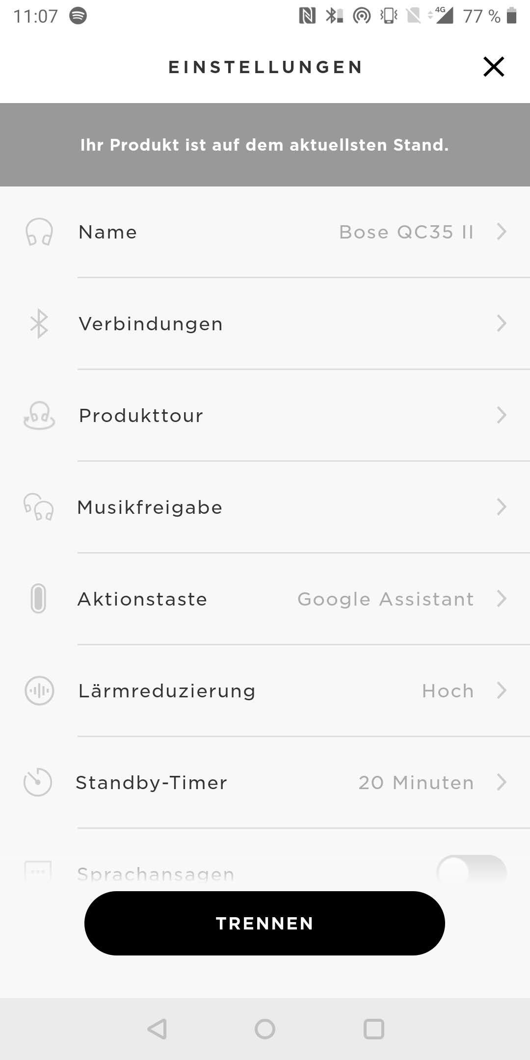 Zudem gibt es noch die Bose-App, in welcher Ihr die Funktionsweise der Aktionstaste ändern, den Grad der Geräuschreduzierung auswählen und den Standby-Timer aktivieren könnt, um die Kopfhörer nicht ausversehen über Nacht ohne Benutzung anzulassen und Akkulaufzeit zu verschwenden (sehr praktisch!).