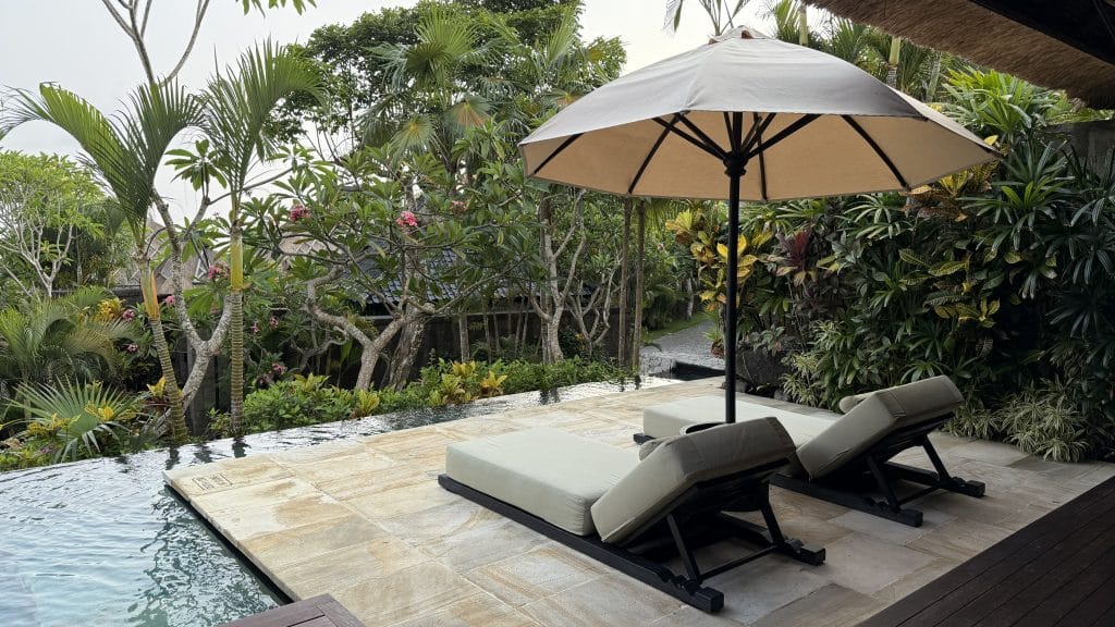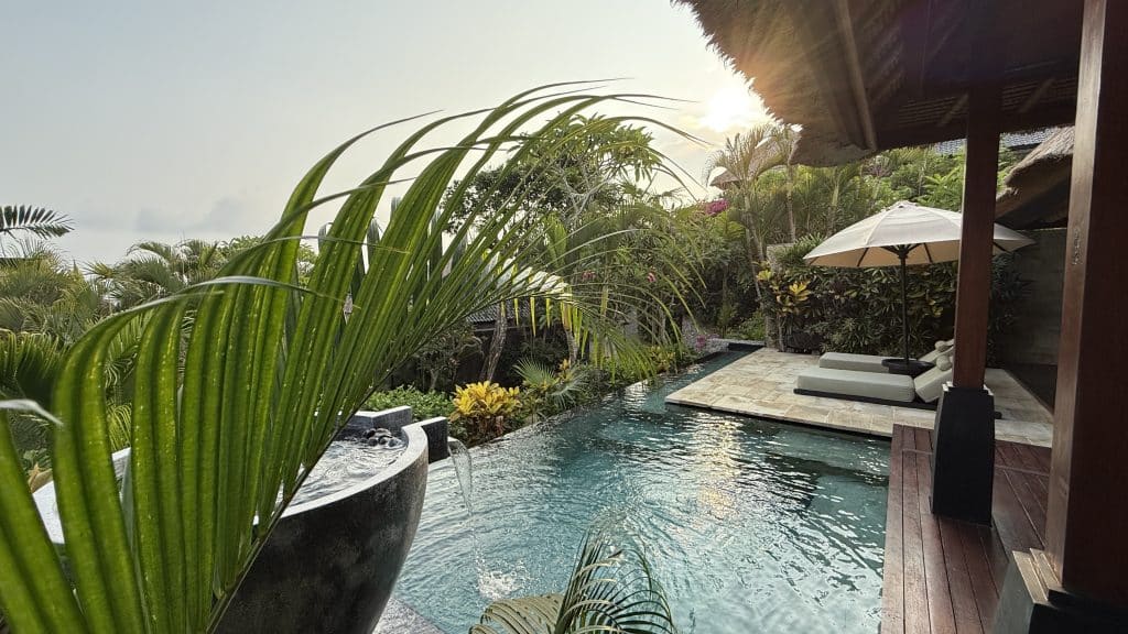 Der Plunge Pool der Villa war gut temperiert, selbst am Abend konnte man bei Dunkelheit noch einmal das Bad genießen. Durch den kleinen Brunnen kommt immer eine angenehme Atmosphäre auf, über Nacht wird dies ausgeschaltet, denn man kann das Plätschern zum Teil auch in der Villa hören – mir persönlich gefällt es, aber geräuschempfindliche Gäste könnten sich hier gestört fühlen.