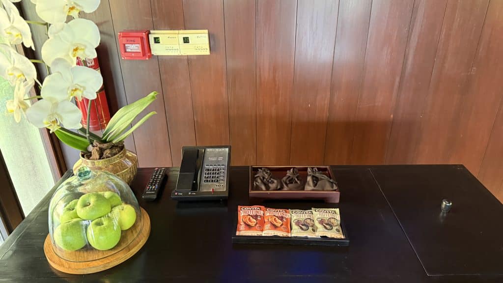 Sobald man die Villa betritt, umgibt einen die frische Luft der Klimaanlage, welche wirklich gut funktioniert. Freilich lässt sich diese ganz nach Bedürfnis regulieren. Im Eingangsbereich ist ein Schreibtisch mit Steckdosen – europäische Stecker passen ohne Adapter – und eine kleine Bose Musikbox zu finden.