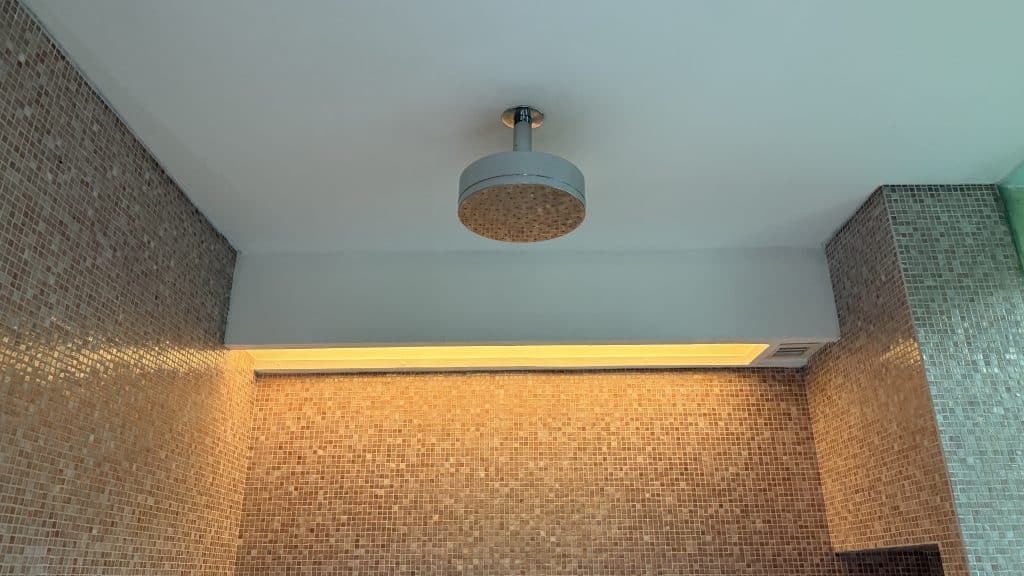 Hier ist auch die Taschentuchbox platziert. Wenngleich dies logisch erscheint, habe ich es selbst als unpraktisch empfunden, da ich diese immer wieder am Waschtisch gesucht und gebraucht habe – sicherlich eine persönliche Wahrnehmung und allemal eine Kleinigkeit. Ansonsten sei noch die Regendusche erwähnt, die in der Ecke des Zimmers zu finden.