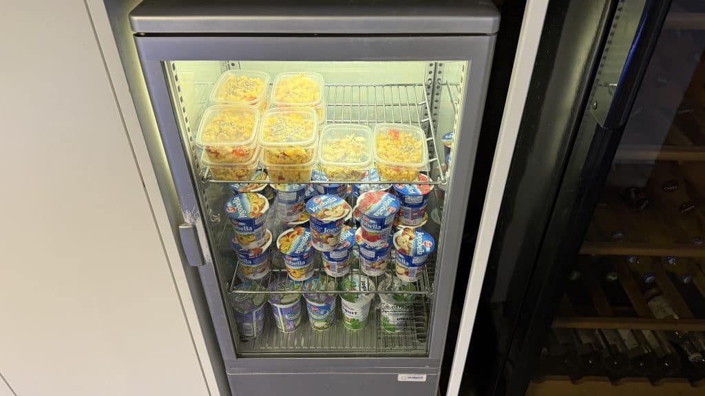 In einem Kühlschrank gibt es zudem noch kleine Salate sowie Joghurts.