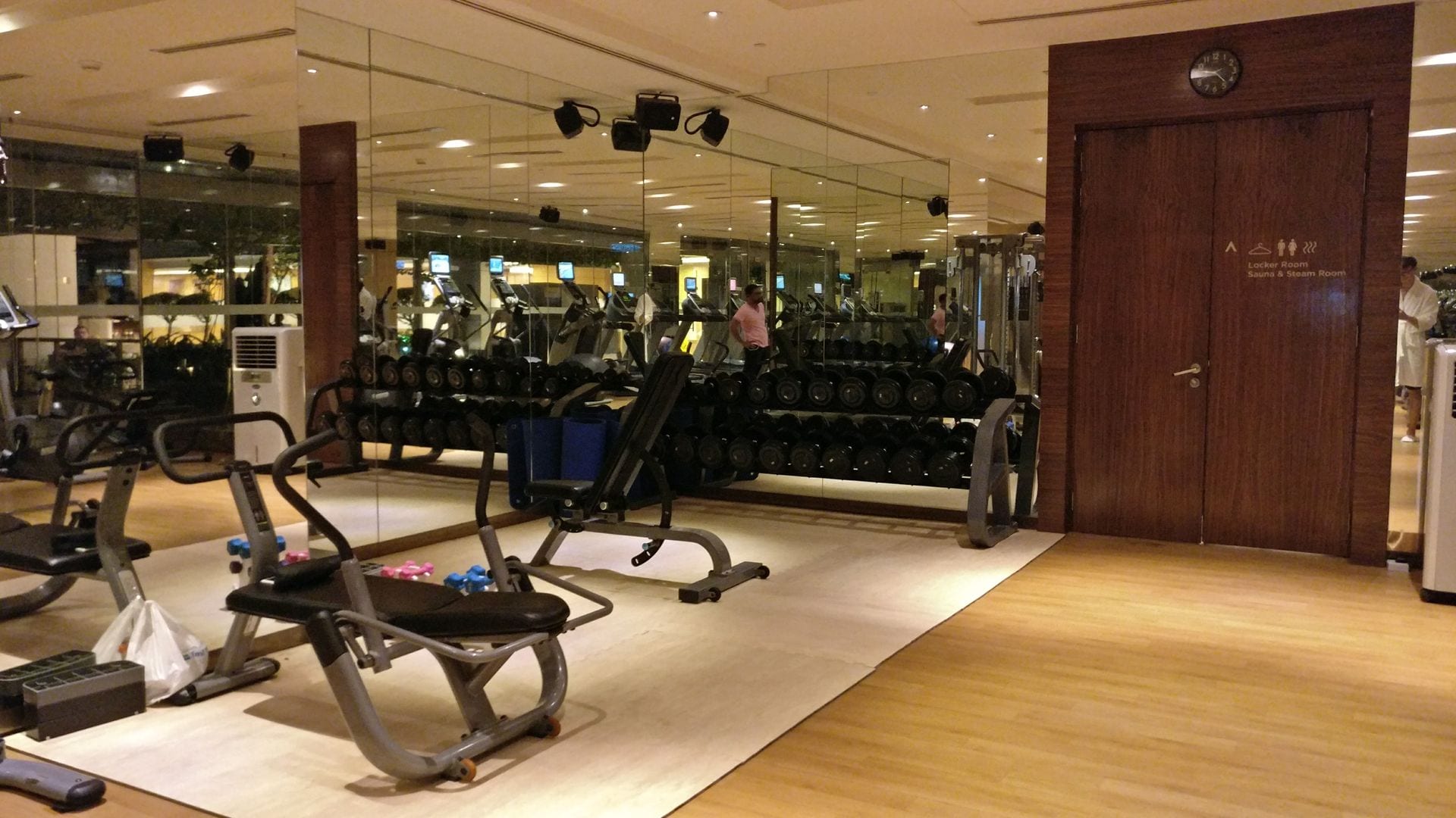 Im DoubleTree findet Ihr einen Fitnessraum mit einer guten Auswahl an Geräten für Krafttraining und Ausdauersport. Man blickt dabei direkt auf den Pool und einige Liegen.