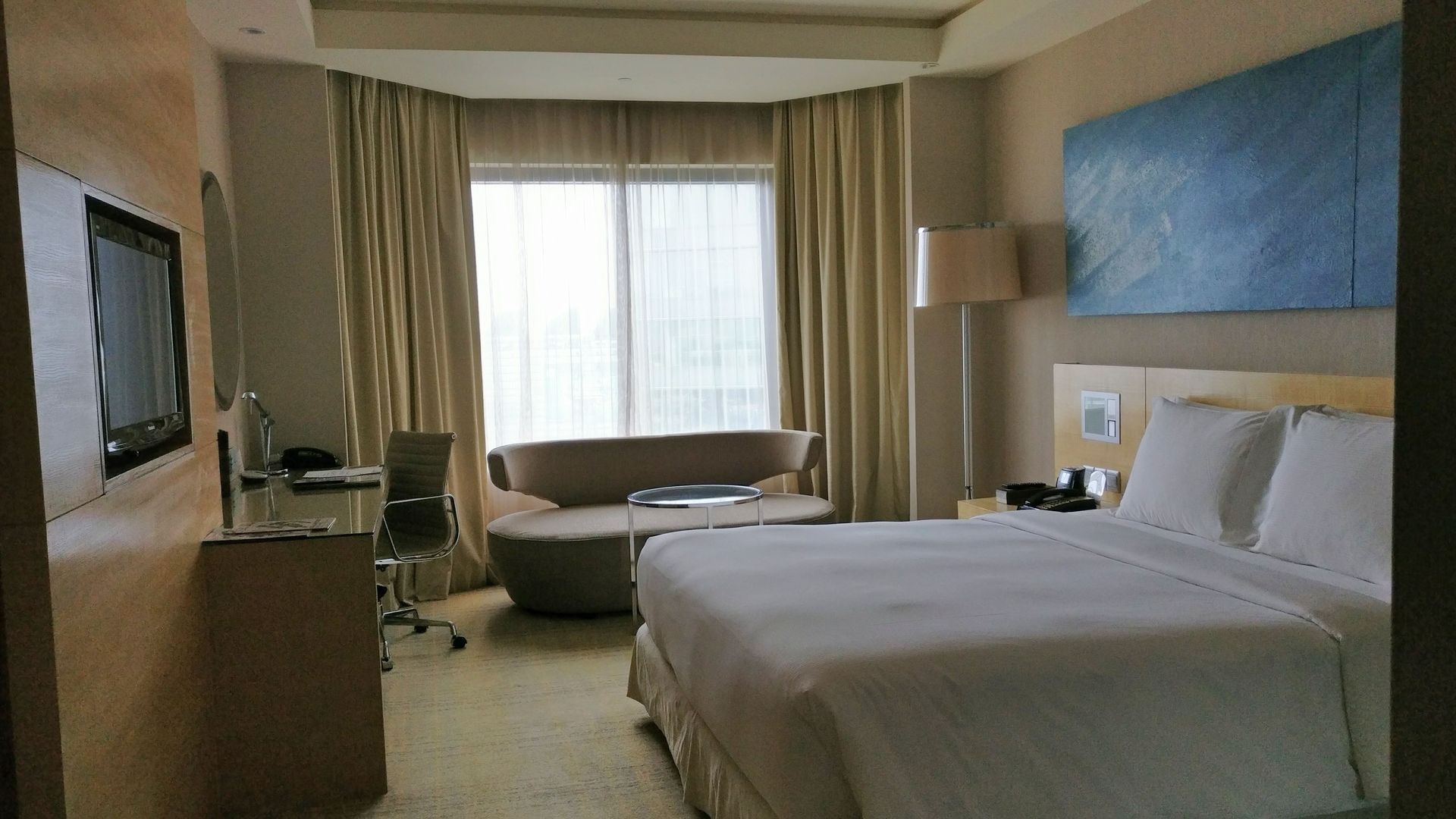 Das Zimmer im DoubleTree ist genau, wie man es von einem Mittelklasse Hilton-Hotel erwartet. Nach dem Eingang findet man ein kleines Bad mit Regendusche. Neben dem Bad ist die Garderobe mit Platz für den eigenen Koffer. Im Raum selbst warten neben dem Bett noch der Schreibtisch auf einen, vor den Fenstern befindet sich noch ein Sofa.