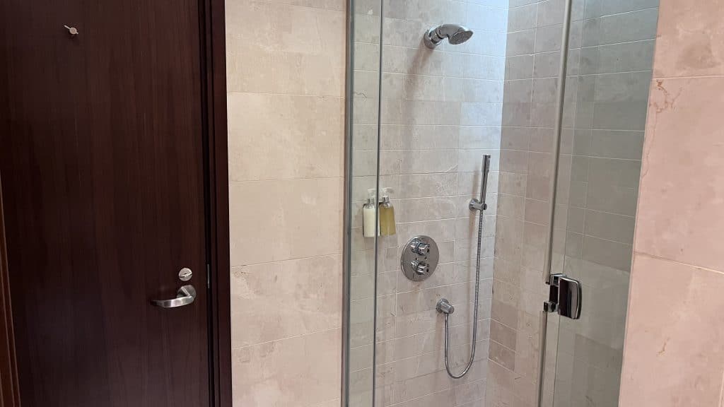 Wie in vielen anderen Lounges stehen auch Duschräume bereit. Während es hier auch eine private Toilette gibt, muss ich ehrlich zugeben, dass mich die Ausstattung und das Design nicht überzeugen konnte – es wirkte bereits etwas älter und abgenutzter. Der Marmor ist sicher hochwertig, aber das gesamte Ambiente hat mir nicht zugesagt.
