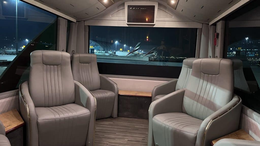 Was zunächst nicht sonderlich attraktiv klingt, ist aber bei Emirates schon ein Highlight, denn der Bus ist ausschließlich für First Class Passagiere gedacht. Daher war ich am Ende allein an Board.