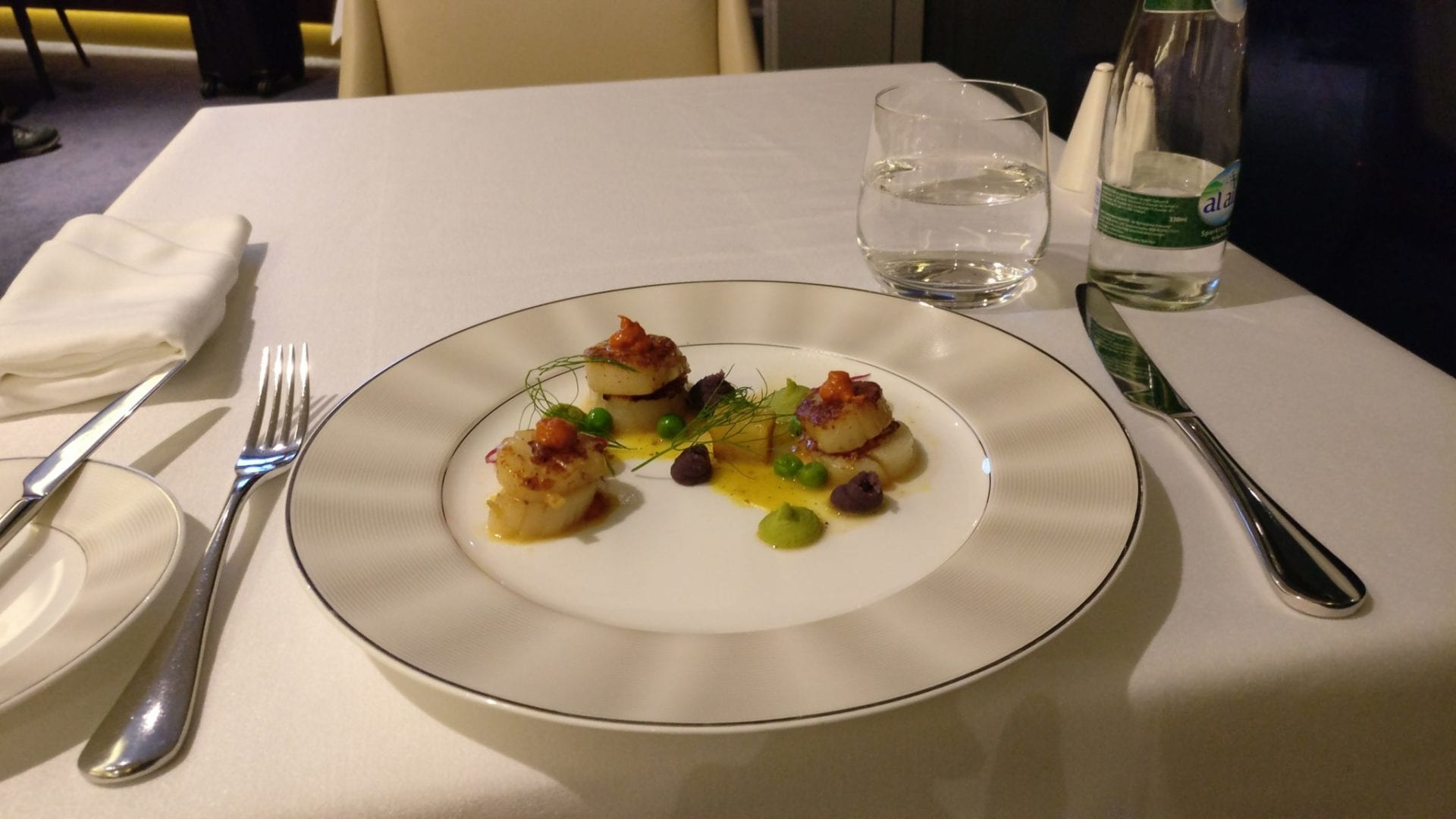 Ich will an dieser Stelle nicht zu sehr ins Detail gehen, weil ich nicht die Gelegenheit hatte, im Restaurant zu essen. Bei beiden Stops in Abu Dhabi hatte ich wenig Hunger, wenig Zeit und wollte lieber noch unter die Dusche und etwas Arbeit erledigen. Entsprechend kann ich nur sagen, dass das kleine Buffet im hinteren Bereich der Lounge zwar nicht viel, dafür eine hohe Qualität bietet. Auch die kleine Barkarte und der Snack, den ich in der Etihad Airways First Class Lounge Abu Dhabi genossen habe, sehr gut waren.
