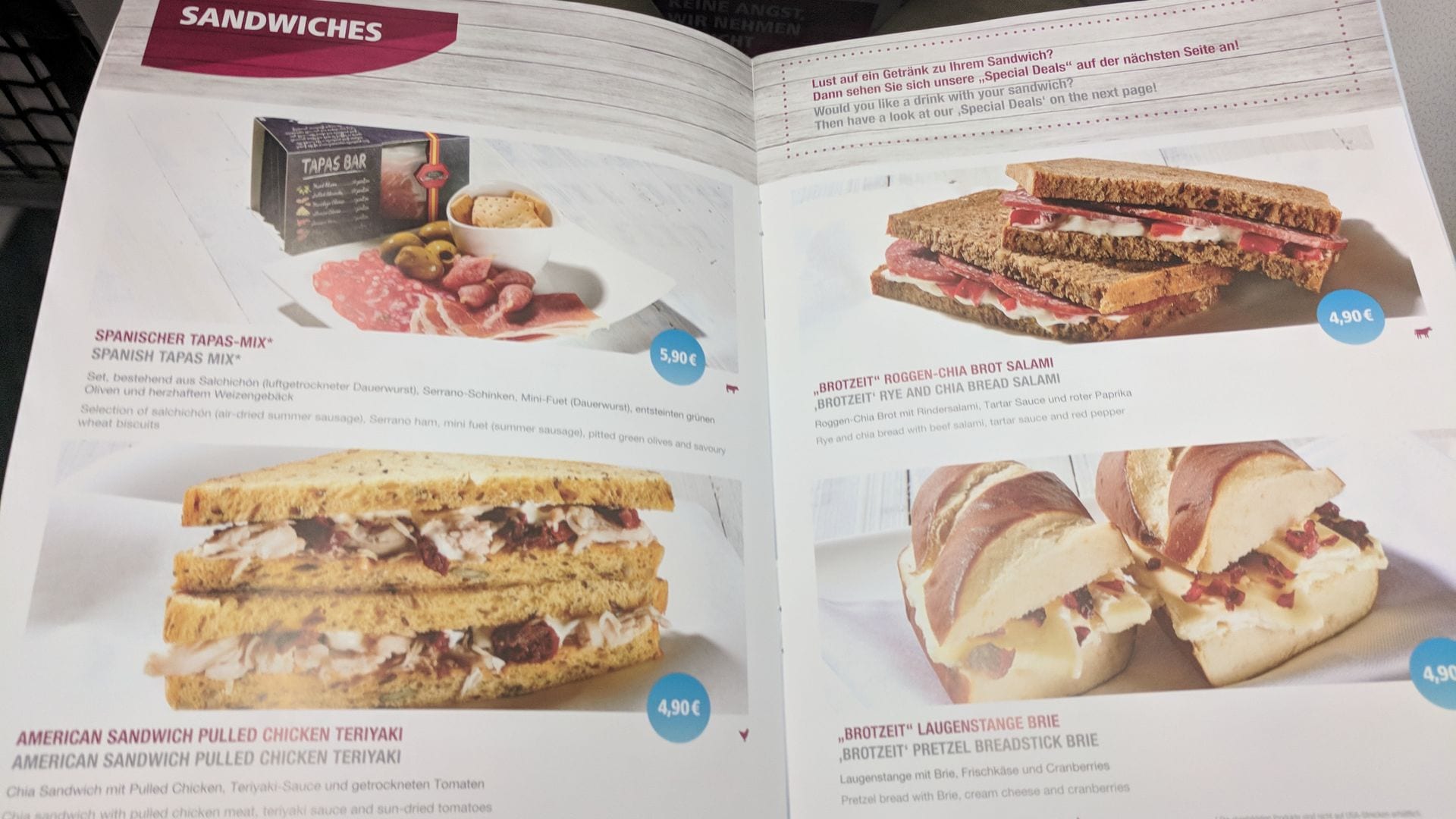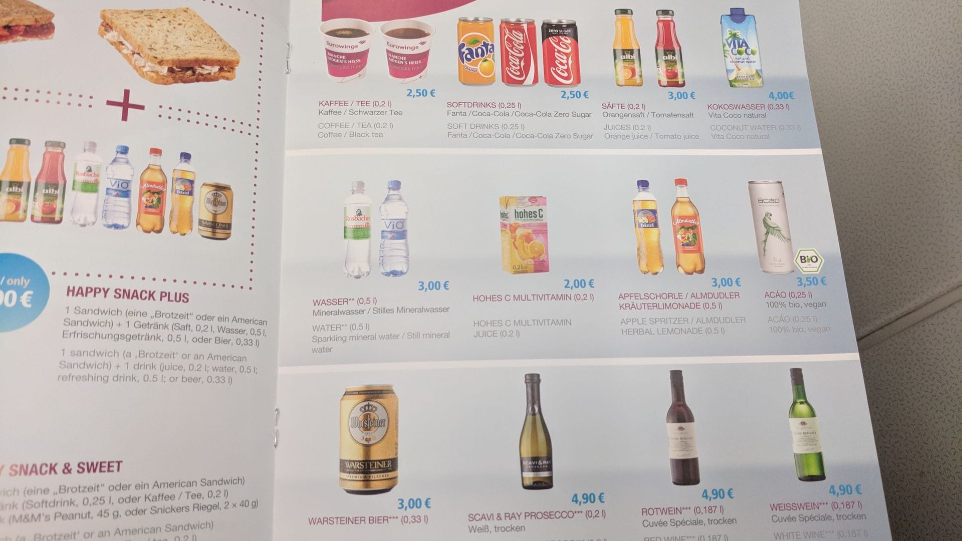 Besonders gelungen finde ich die Auswahl in der Bestellkarte allerdings nicht. So fehlen neben Gin Tonic & Co. auch warme Snacks. Die Auswahl besteht aus ein paar Sandwiches sowie süßen und salzigen Knabbereien. Ryanair und easyJet bieten da deutlich mehr Auswahl an Bord.