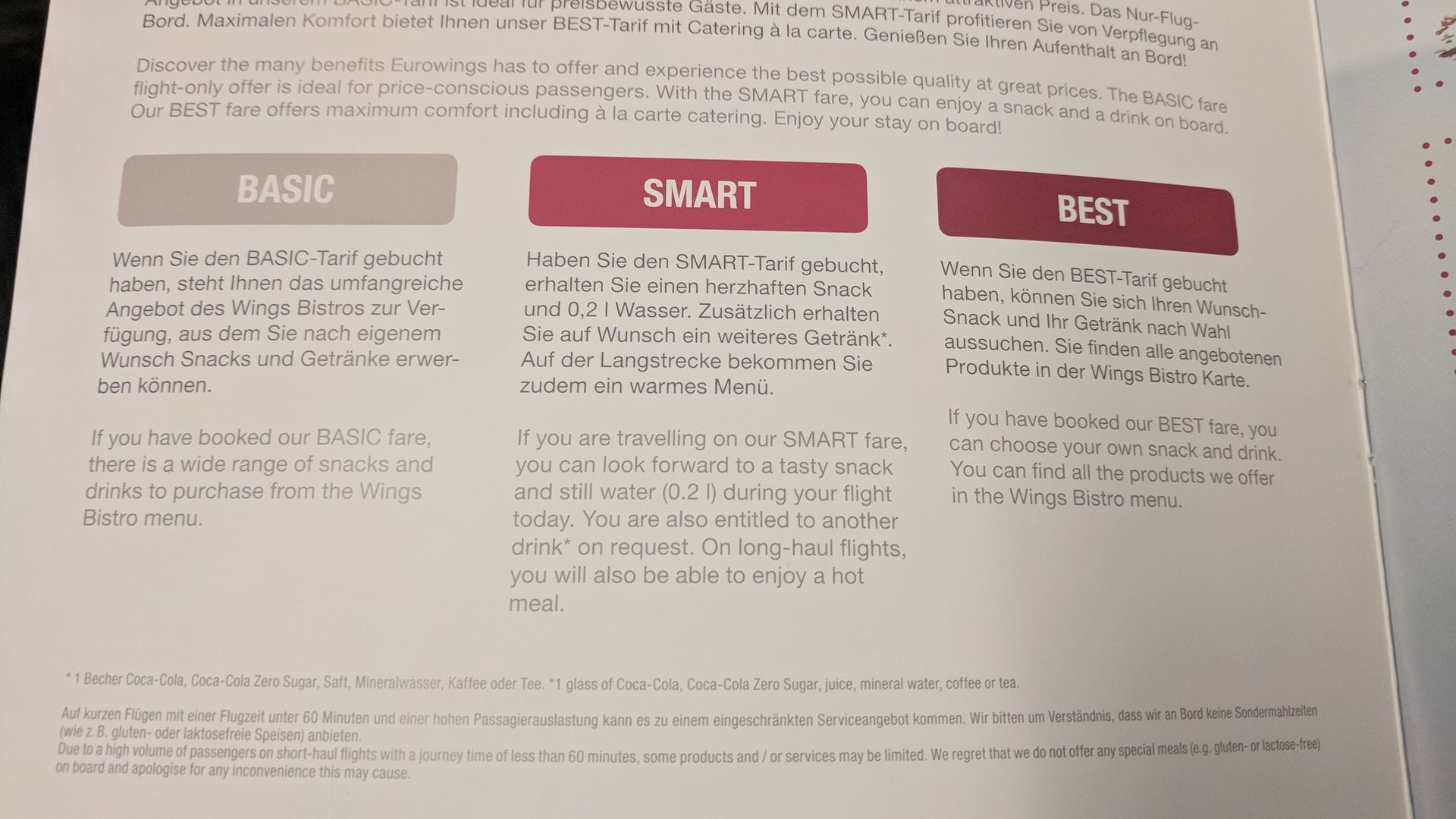 – auf dem Flug von Hamburg nach Stuttgart wurde mir weder ein Snack noch ein Getränk angeboten, dieses sei angeblich in meinem Tarif nicht enthalten ? dabei habe ich den Smart Tarif gebucht und im Gegensatz zu anderen Passagieren mein Gepäckstück aufgegeben, hierfür im Smart Tarif auch extra dafür bezahlt ! während andere Passagiere diese Leistung dann auf Grund der Auslastung der Maschine sogar noch auf Hinweis als Extraleistung kostenfrei bekommen ? vielleicht sollte ich meinen Koffer künftig auch mit in die Kabine schleppen und dann auch noch Platz dafür in einem Fach einfordern, an dessen Platz ich gar nicht sitze ? zum Thema Gepäck später noch einmal mehr…