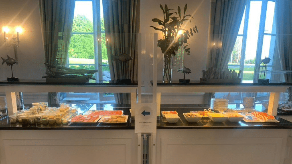 Auf der anderen Seite befindet sich zudem eine weitere Theke mit frischem Fisch, darunter Lachs und Butterfisch sowie geschnittenes Gemüse. Auch hier ist die Qualität ausgezeichnet und die Auswahl – wie würde man es an der Ostseeküste in diesem 5-Sterne-Luxushotel auch anders erwarten – vielfältig.