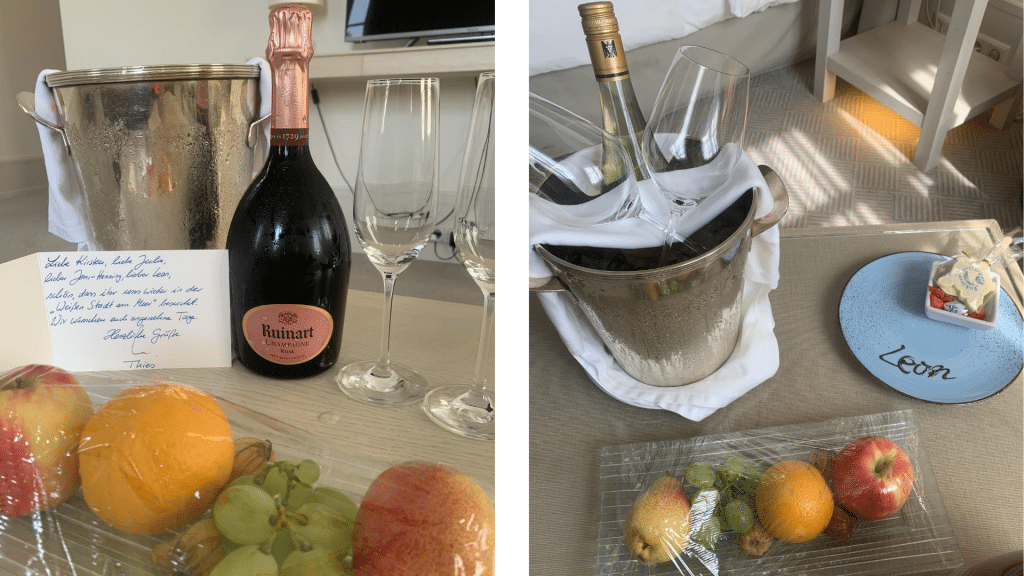 Als kleines Willkommensgeschenk gibt es für jeden Gast eine frische Obstplatte auf dem Zimmer und für die kleineren Gäste wird mit einer Süßigkeitenschüssel auf den hoteleigenen Kidsclub hingewiesen. Wir wurden zudem mit einer Flasche Wein und einer Flasche Champagner begrüßt. Willkommener kann man sich nicht mehr fühlen.