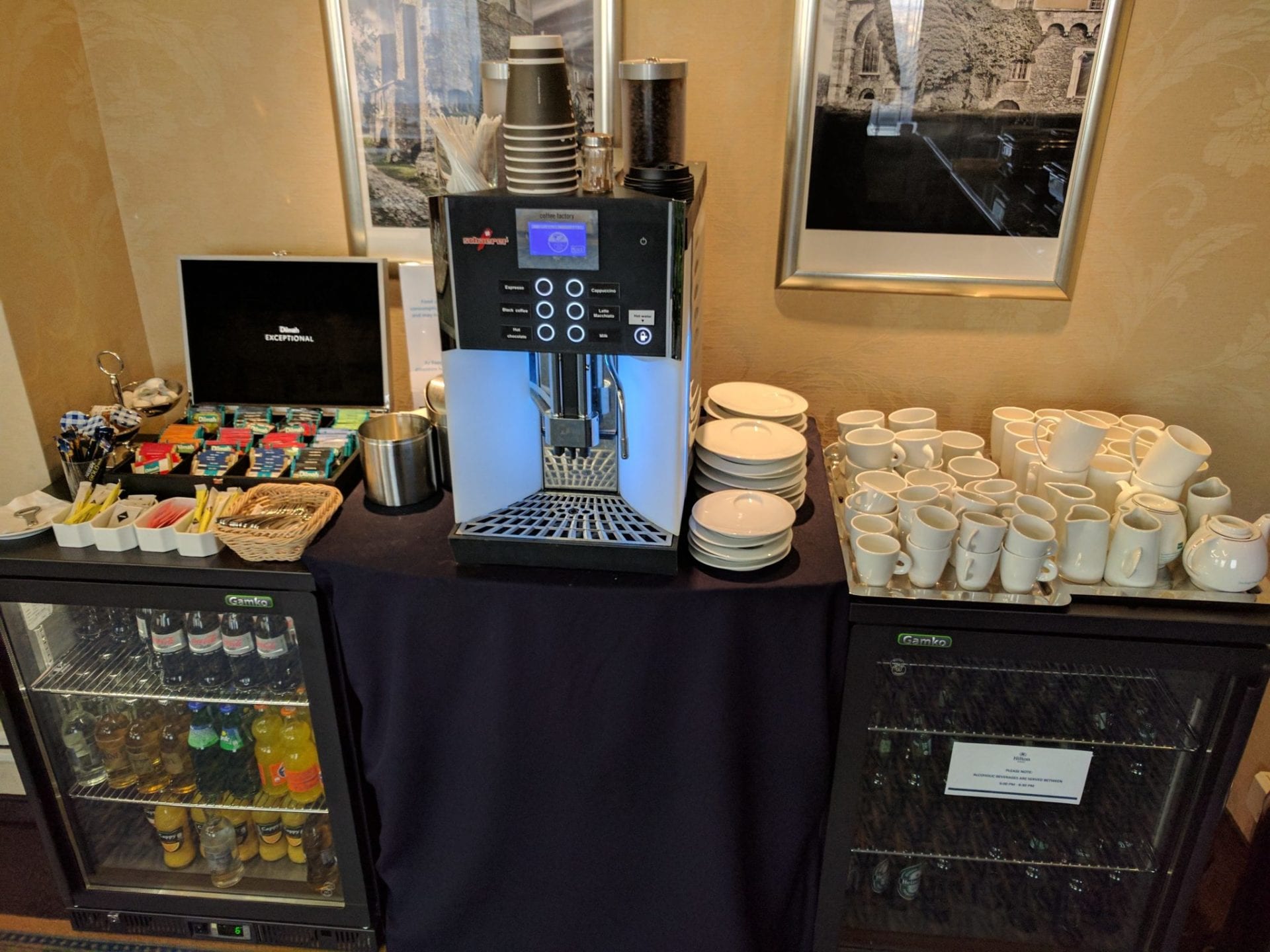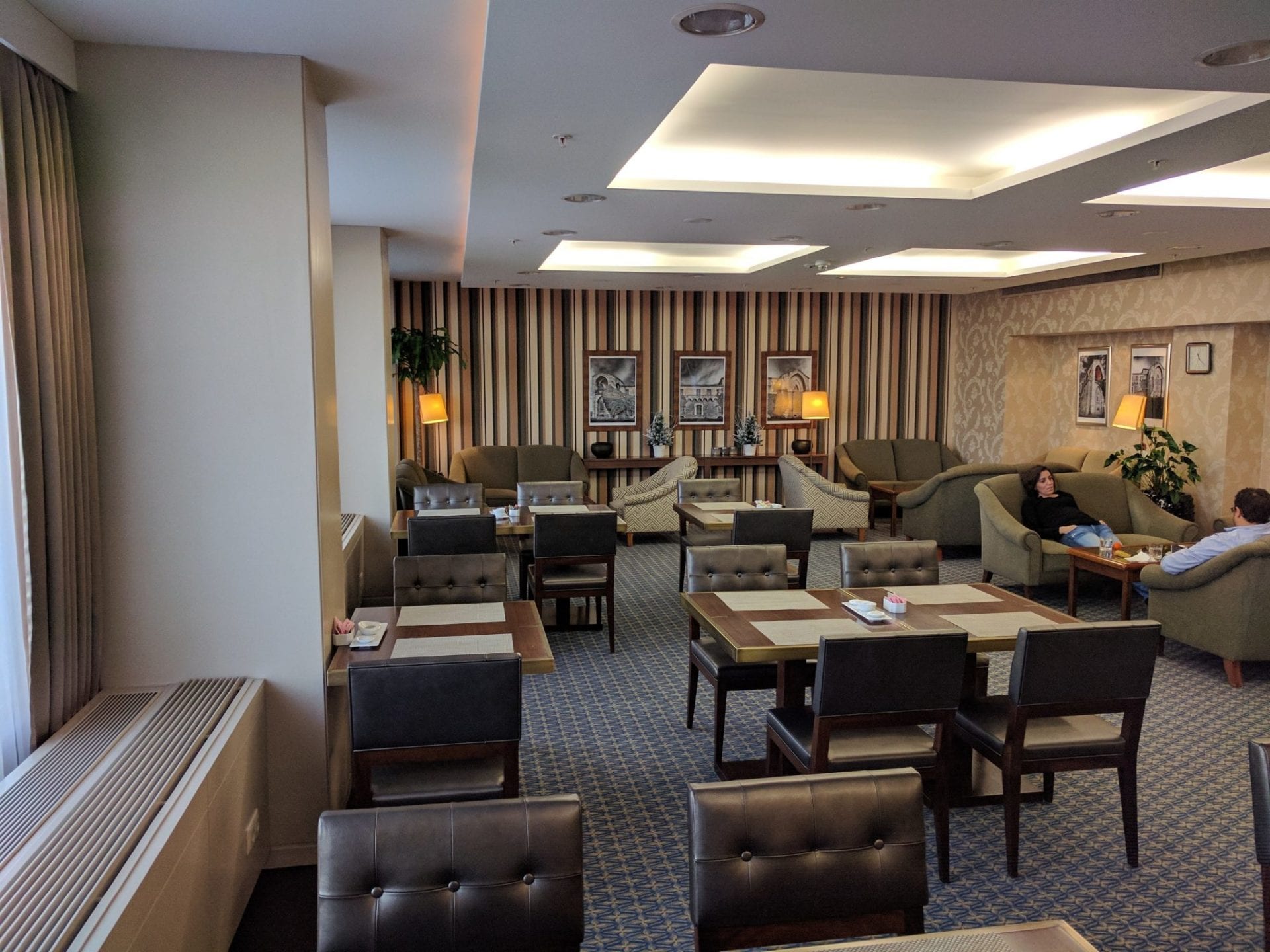 Aufgrund der Renovierungsarbeiten verfügt das Hilton Budapest zur Zeit über eine provisorische Lounge in einem der Konferenzräume im Keller. So wirklich überzeugen kann die Aufmachung dort nicht, auch die wenigen Sitzgelegenheiten sind alles andere als komfortabel.