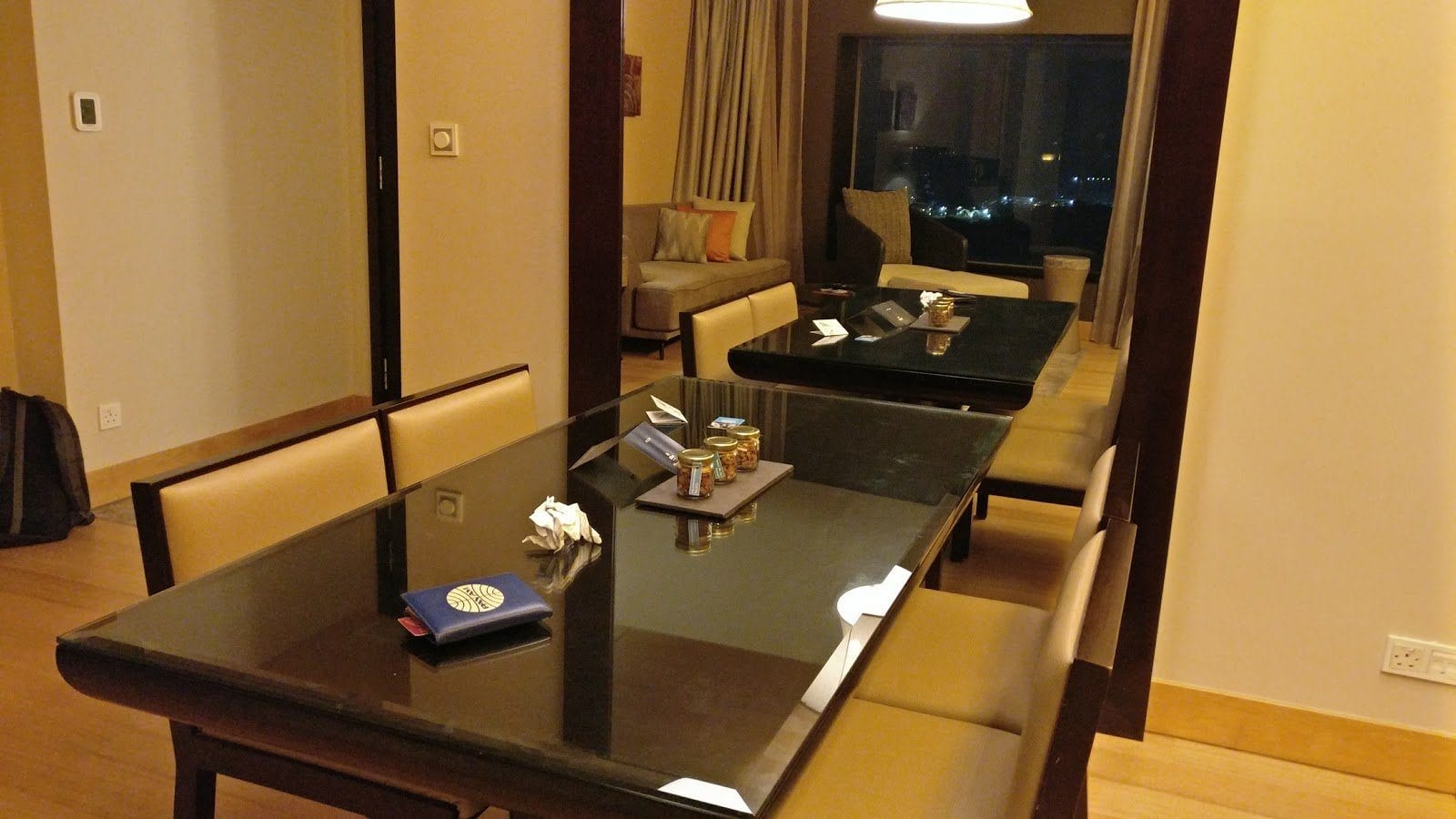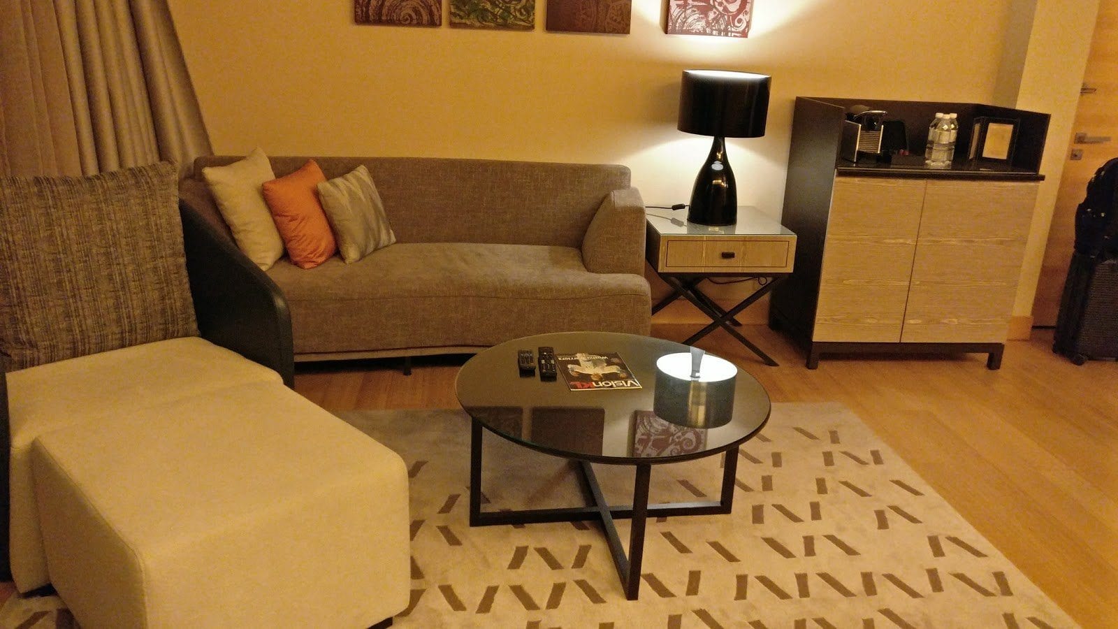 Wir erhielten nach einer E-Mail-Nachfrage vor unserem Aufenthalt ein sehr großzügiges Upgrade auf eine Executive Suite, was wieder einmal klar macht: fragen kostet nichts! Nach dem Eintreten in die Suite befindet man sich im Wohnzimmer, welches einen tollen Ausblick über Kuala Lumpur bietet. Das Wohnzimmer in der Suite des Hilton Kuala Lumpur ist angenehm groß und bietet neben einem großen Esstisch und einem Sofa auch eine Nespresso Maschine, sowie direkt neben der Eingangstür ein kleines Badezimmer.