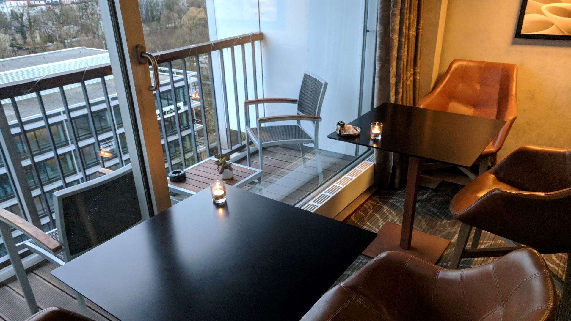 Das Hilton München Park bietet auf der 12. Etage auch eine Executive Lounge. Dabei handelt es sich um eine langen Raum einer Fensterfront entlang, auch hier mit Außenbereich. Leider war die Lounge während meines Aufenthaltes recht gut besucht, weshalb ich kein Foto der gesamten Lounge präsentieren kann. Allgemein überzeugt die Executive Lounge im Hilton München Park aber schon durch die verschiedenen Sitzgelegenheiten zum Arbeiten, Essen und Entspannen. Insgesamt ist die Executive Lounge wie die Gästezimmer modern eingerichtet.