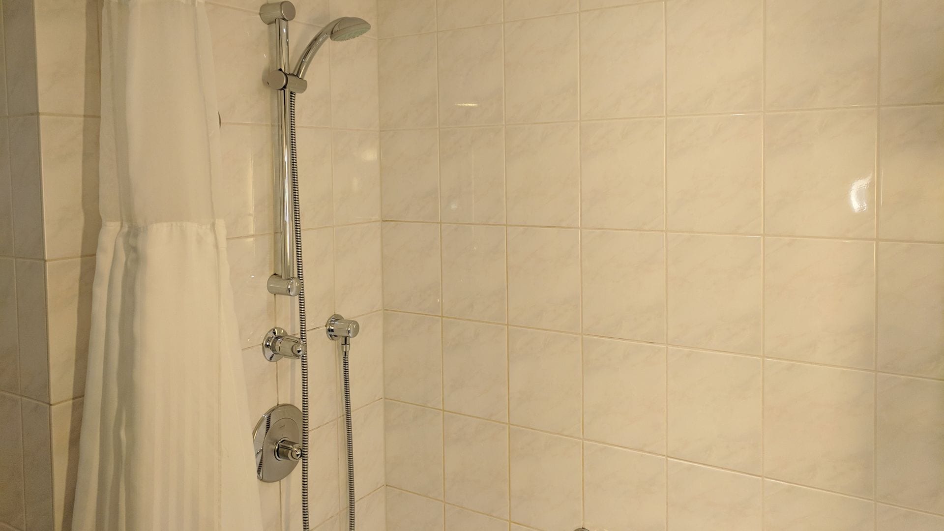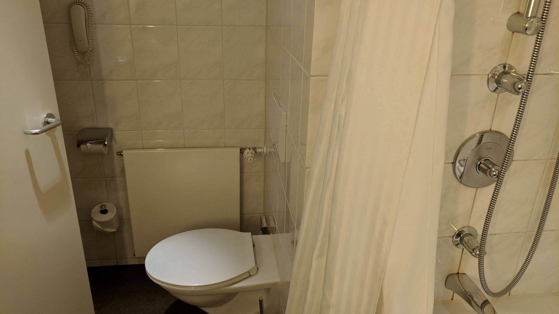 Nicht besonders ansehnlich im Vergleich zum restlichen Zimmer fand ich dagegen das Bad. Dieses ist zwar vergleichsweise geräumig, bietet aber dennoch keine separate Dusche. Das Badezimmer kommt recht altbacken daher, die Dusche mit Vorhang machte auch einen recht unappetittlichen Eindruck. Wieso man bei der Renovierung diesen Teil außen vor gelassen hat, ist mir unerklärlich.