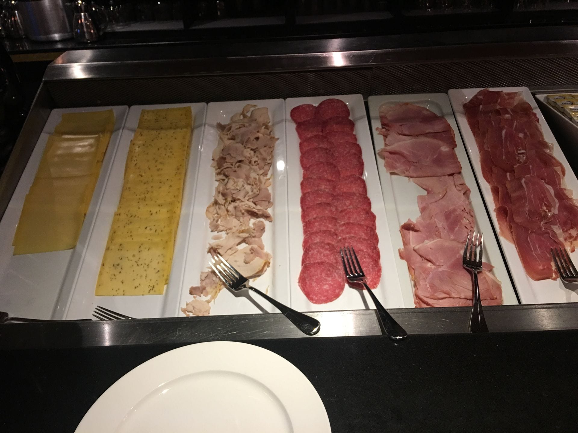 Es gibt eine breite Auswahl an Aufschnitt, Joghurt, Cornflakes und die typischen warmen Frühstücksspeisen. Wie in Hilton Hotels üblich, kann man auch frisch zubereitete Eierspeisen bestellen, etwa Spiegeleire. Besonders positiv sind die typischen holländische Poffertjes (kleine Pfannkuchen).