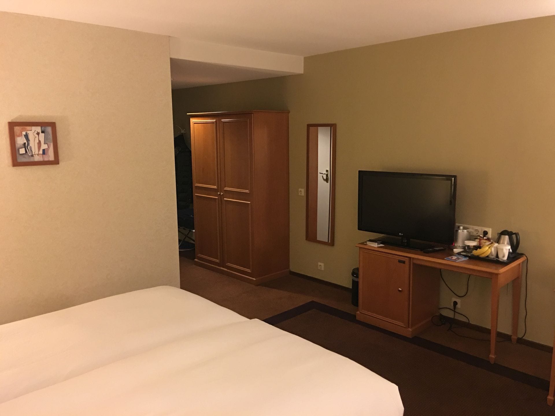Die Betten sind sehr gut, es gibt einen großen Schreibtisch, einen Flachbildschirm mit vielen deutschen Sendern, an dem man aber leider nicht seine eigenen Geräte anschließen kann. Auch einen Wasserkocher mit einer Auswahl an Tee und Kaffee gibt es. Ein kleines Willkommensgeschenk gab es zudem auch.