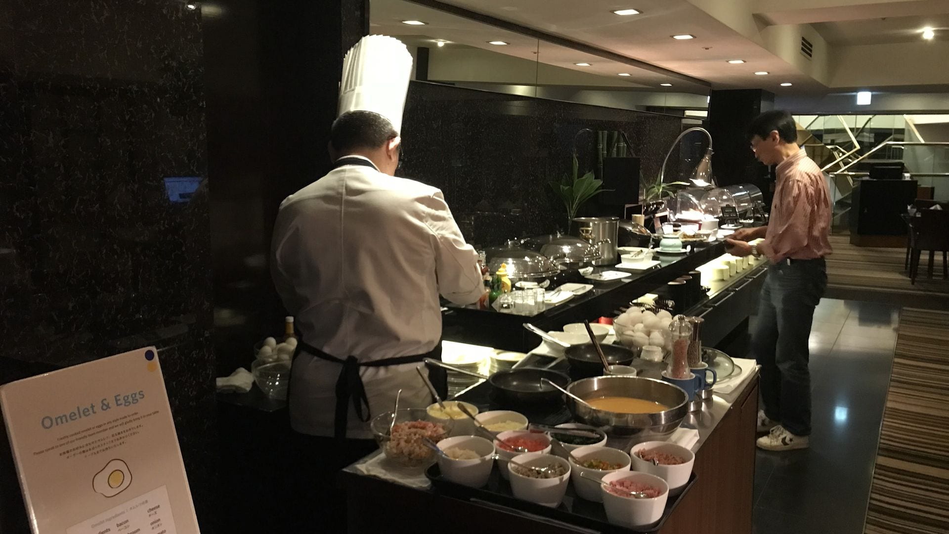 Auch frische Eierspeisen werden in der Executive Lounge vorbereitet. Von vielen Hiltons kennt man ein eher bescheidenes Frühstücksangebot in der Executive Lounge, wobei das Restaurant sehr viel mehr bieten. Dabei fällt mir vor allem das Hilton Capital Grand Abu Dhabi als Beispiel ein. Vor allem, wenn es als Hilton Honors Gold dann nur Zugang zur Executive Lounge gibt und kein Frühstück im Restaurant, ist das doch sehr schade. Im Hilton Tokyo erwartet Euch ein überdurchschnittliches Frühstück in der Lounge, die eine tolle Atmosphäre bietet.