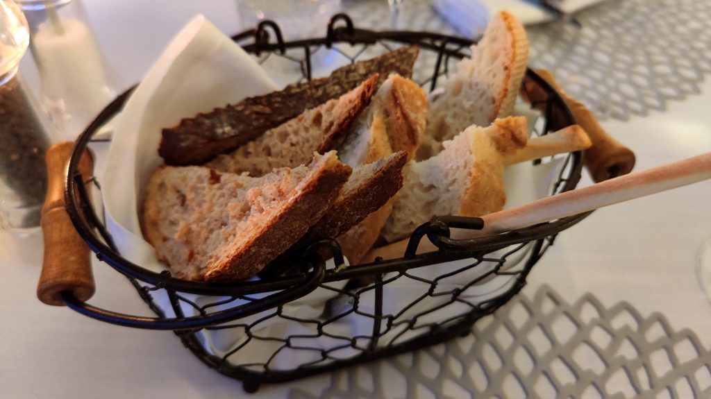 Zur Auswahl stehen jeweils zwei Hauptgerichte und zwei Vorspeisen, beim Dessert gibt es keine “Wahl”. Vor der Mahlzeit wird zudem immer noch ein Brotkorb serviert.