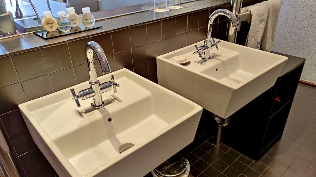 Sozusagen in der Mitte des Raums befindet sich das Bett, hinter dem die Waschbecken zu finden sind und das mit einer Ablage dazwischen statt Nachttischen daherkommt.
