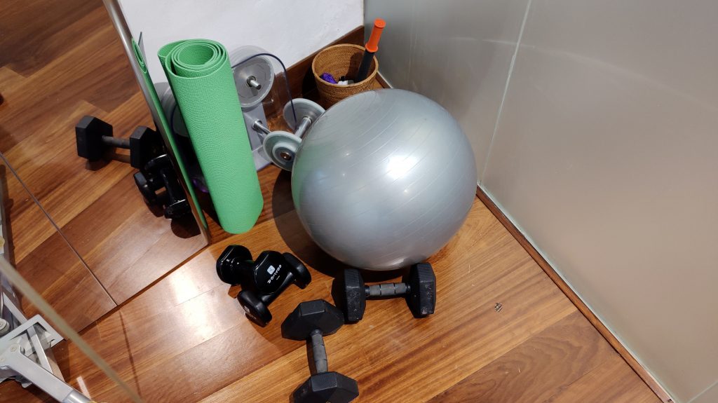 Zudem liegen noch ein paar Gewichte und Yoga-Matten herum.