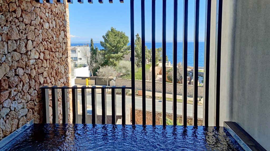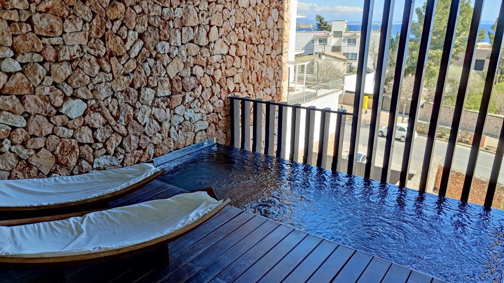 Der Außenbereich der Natura Deluxe Zimmer im Hospes Maricel Mallorca hat meines Erachtens durchaus Charme. Man darf sich über einen kleinen Plunge Pool sowie zwei mittelmäßig bequeme Liegen freuen.