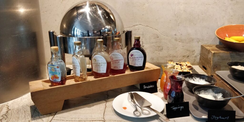 Abgerundet wird das Buffet durch eine süße Ecke mit Waffeln und Pfannkuchen, hier sogar mit einer Auswahl an verschiedenem Ahornsirup.