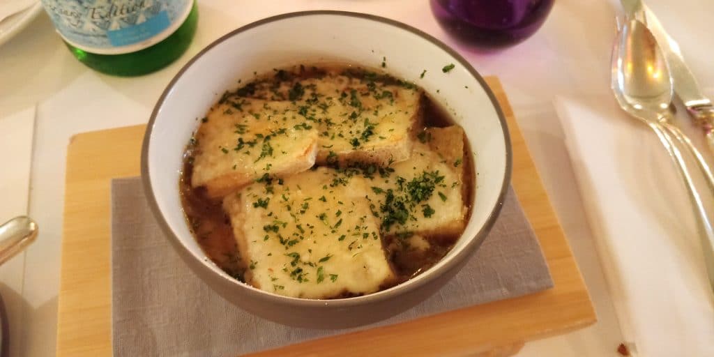 Als Vorspeise gab es eine französische Zwiebelsuppe, die ich als sehr schmackhaft wahrgenommen, wenn auch füllend wahrgenommen habe.