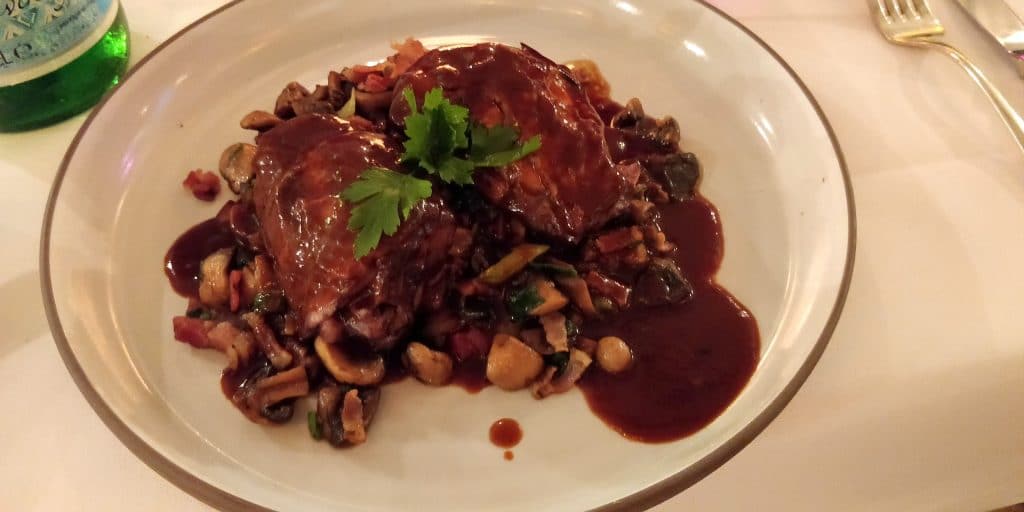 Danach folgte als Hauptspeise ein weiterer französischer Klassiker: Coq au Vin. Auch hier war die Portionsgröße ausgesprochen groß.