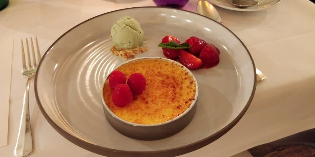 Für das Dessert war so kaum mehr Platz, aber die leckere Creme Brulée möchte wohl niemand auslassen – besonders lecker fand ich auch das dazu sevierte Eis sowie die Früchte.
