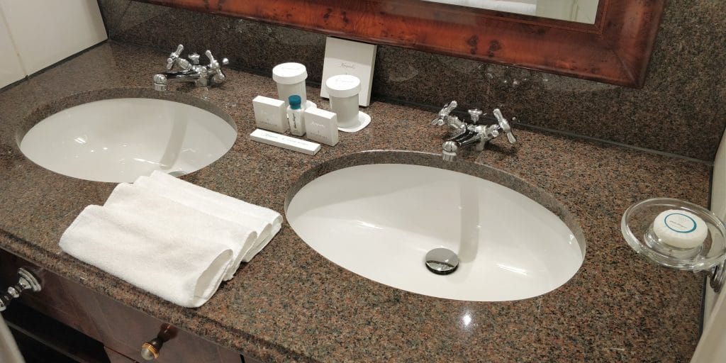 Direkt hinter der Tür ist ein Doppelwaschtisch auf der rechten Seite zu finden.
