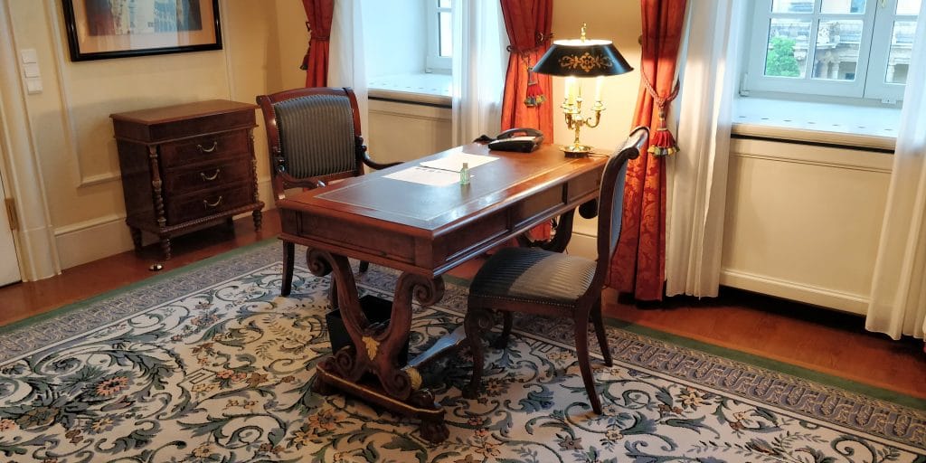 Selbstredend findet man auch einen großen Schreibtisch, der praktischerweise mit zwei Stühlen daherkommt – ergonomisch sind diese aufgrund der Historie aber natürlich nicht.