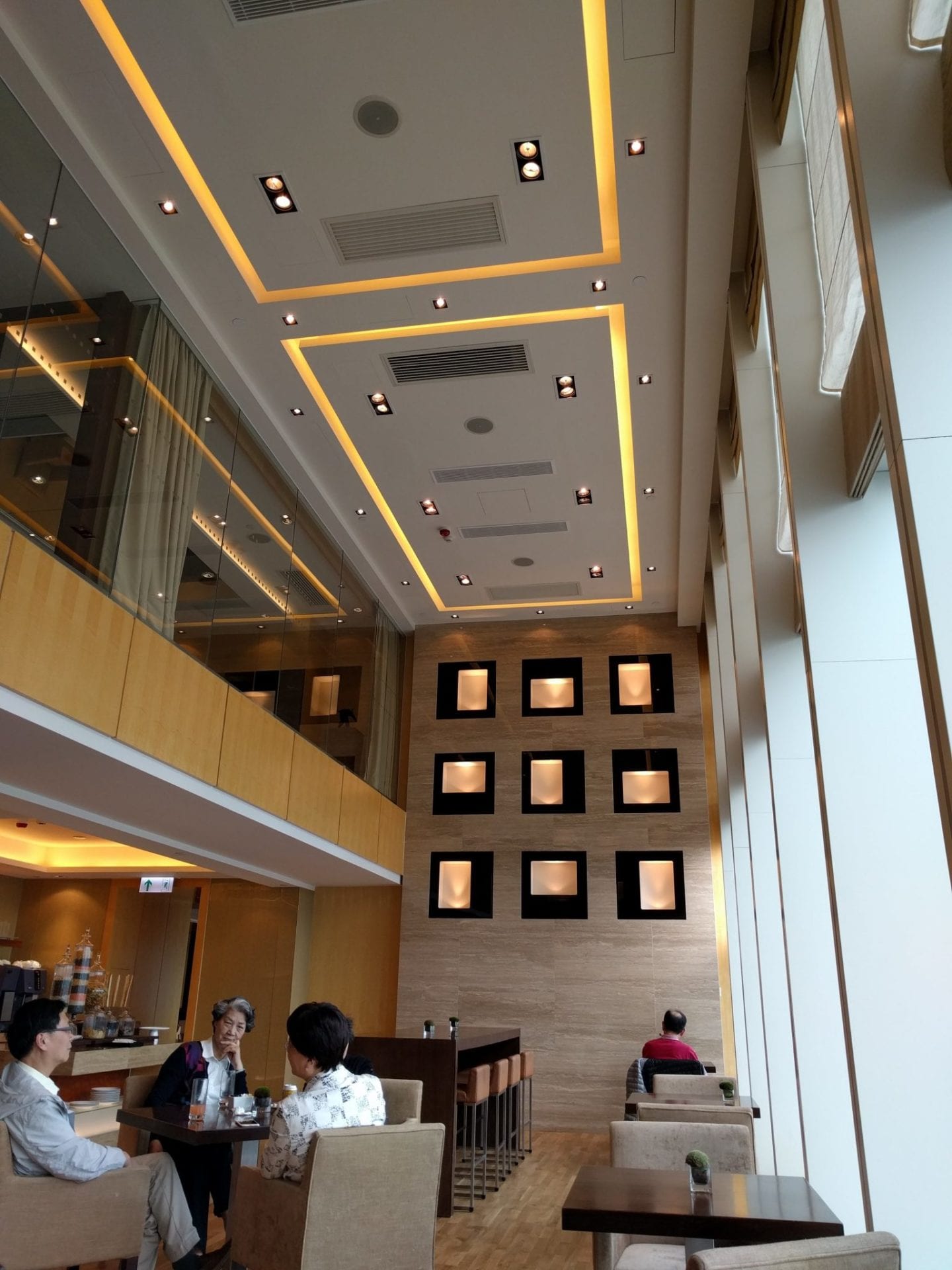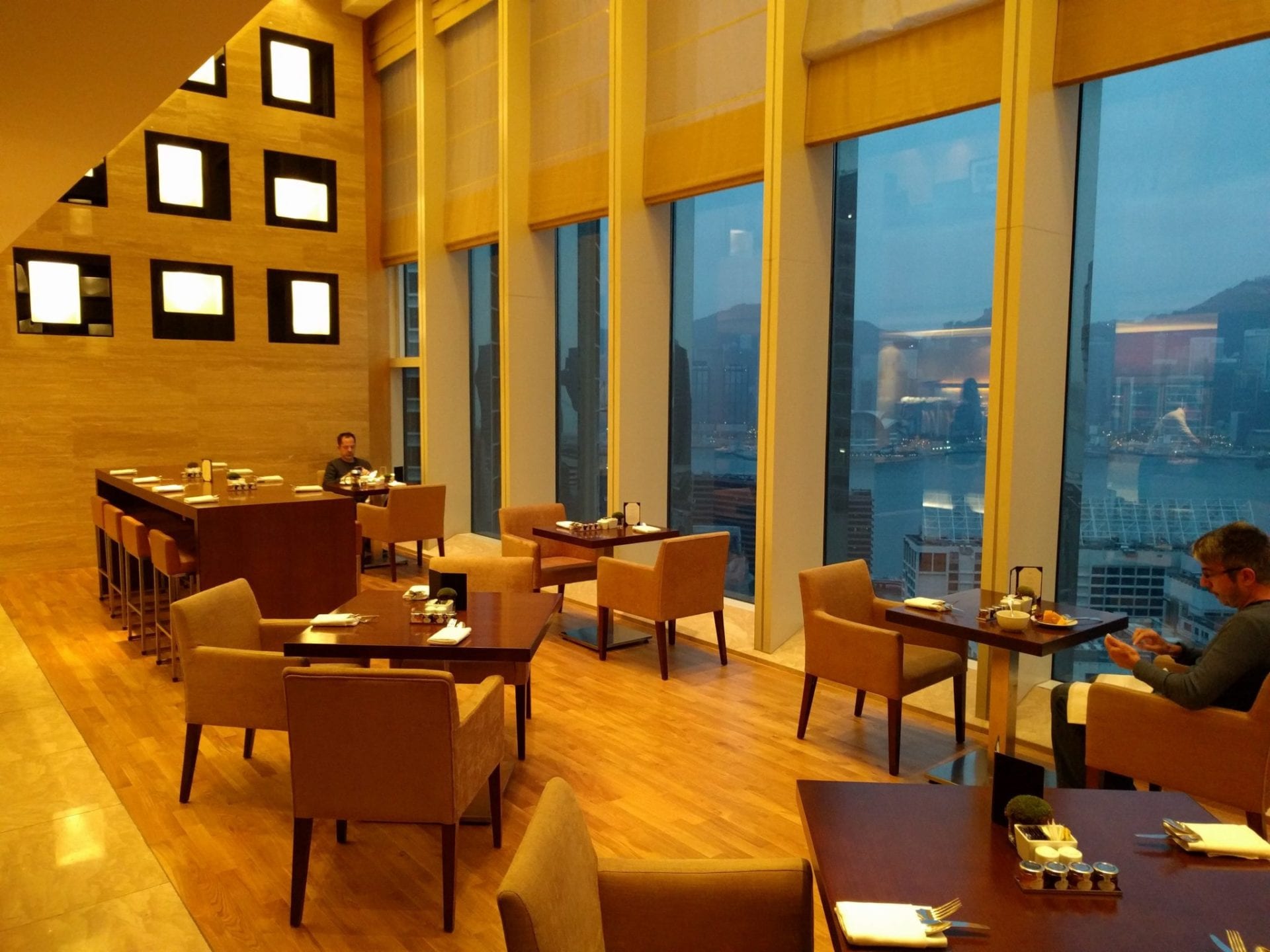 Dank des Upgrades gab es nun auch Zugang zum Regency Club. Beim Betreten fällt sofort die tolle Aussicht auf Hong Kong Island auf, auch die Symphony of Lights lässt sich prima aus der Club Lounge beobachten. Die Lounge ist in zwei Räume aufgeteilt, auf der oberen Ebene findet Ihr zusätzlich noch Meetingräume (kostenfrei nutzbar für eine Stunde pro Tag).