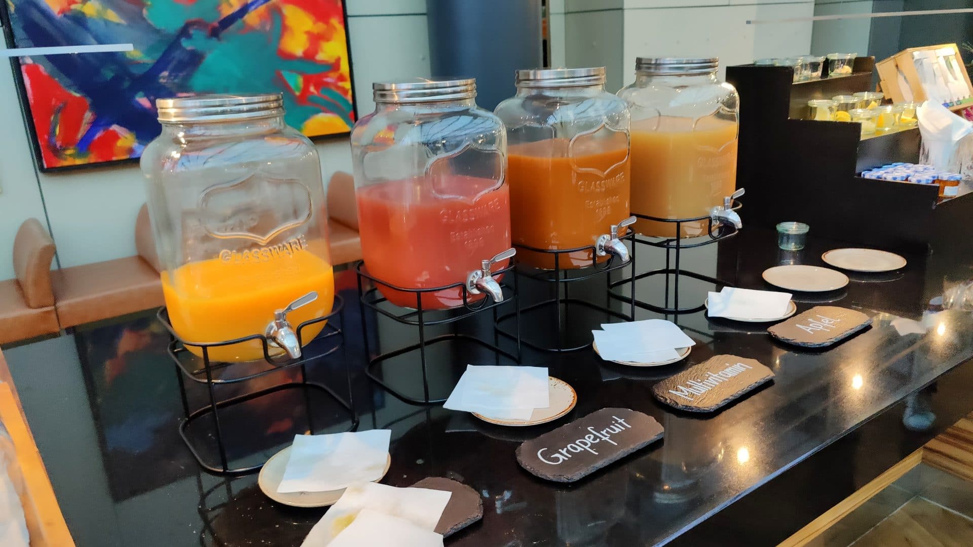 Ansonsten stehen an der Seite des Buffets noch verschiedene Getränkeoptionen bereit, darunter neben Wasser auch viele verschiedene Säfte. Ebenfalls im Angebot ist lokaler Sekt.