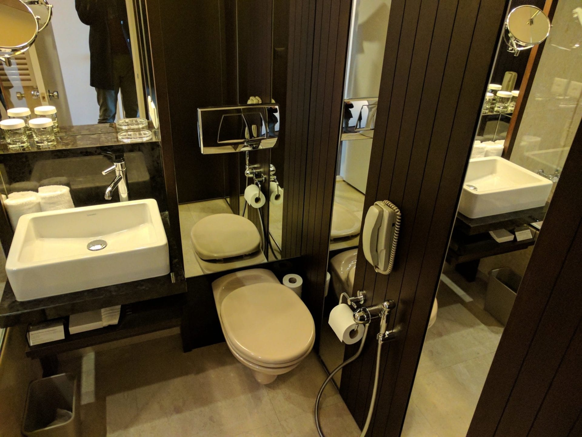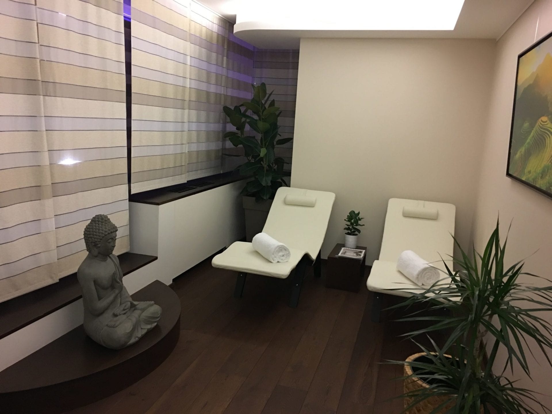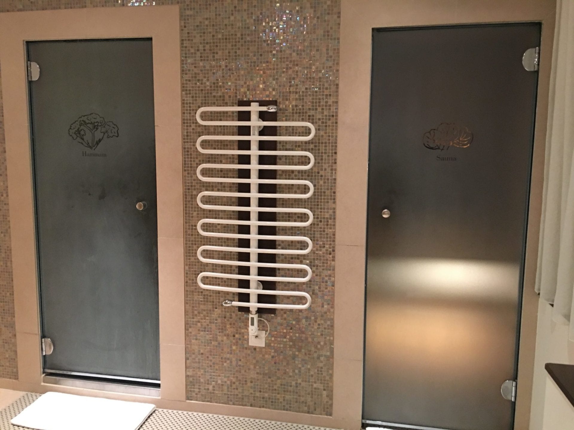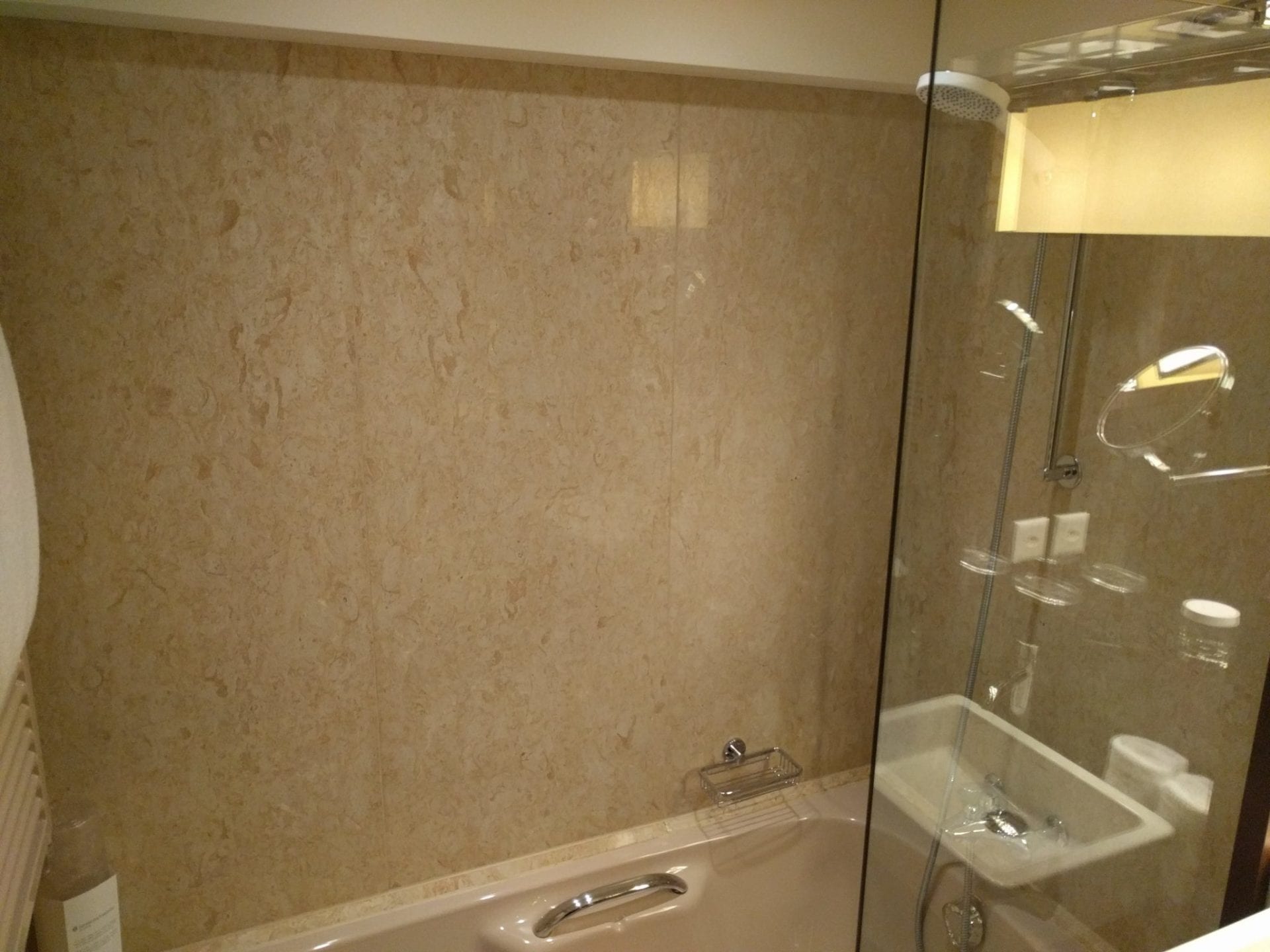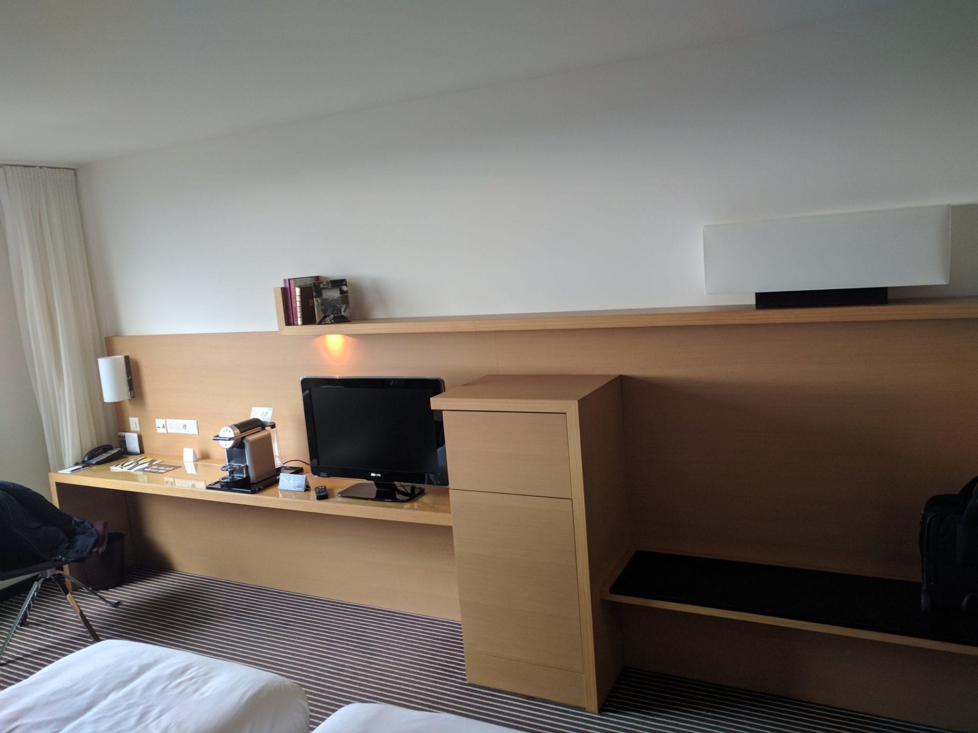 Ausgestattet ist das Zimmer klassisch mit zwei Betten, einem kleinen Schreibtisch, diversen Schränken und einer kleinen Couch. Wirklich überzeugt war ich von der Einrichtung allerdings nicht. Der Schreibtisch war zu klein, um ernsthaft zu arbeiten, dazu wurde beim Stuhl mehr Wert aufs Design als Ergonomie gelegt. Mit dem Mobiliar konnte ich mich insgesamt nicht wirklich anfreunden, aber dies ist sicherlich auch Geschmackssache. Der Fernseher war ungewohnt klein, aber auch kein Reinfall. Nett waren neben der Nespresso Maschine auch die diversen Bücher auf Englisch und Französisch, die im Zimmer verteilt waren.
