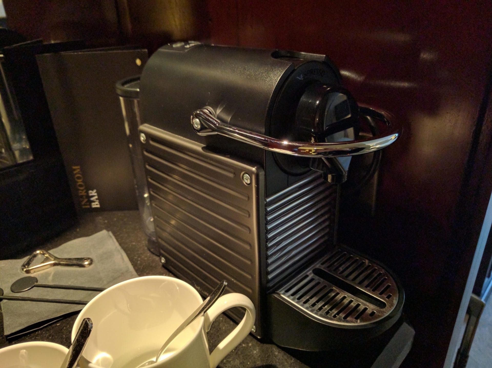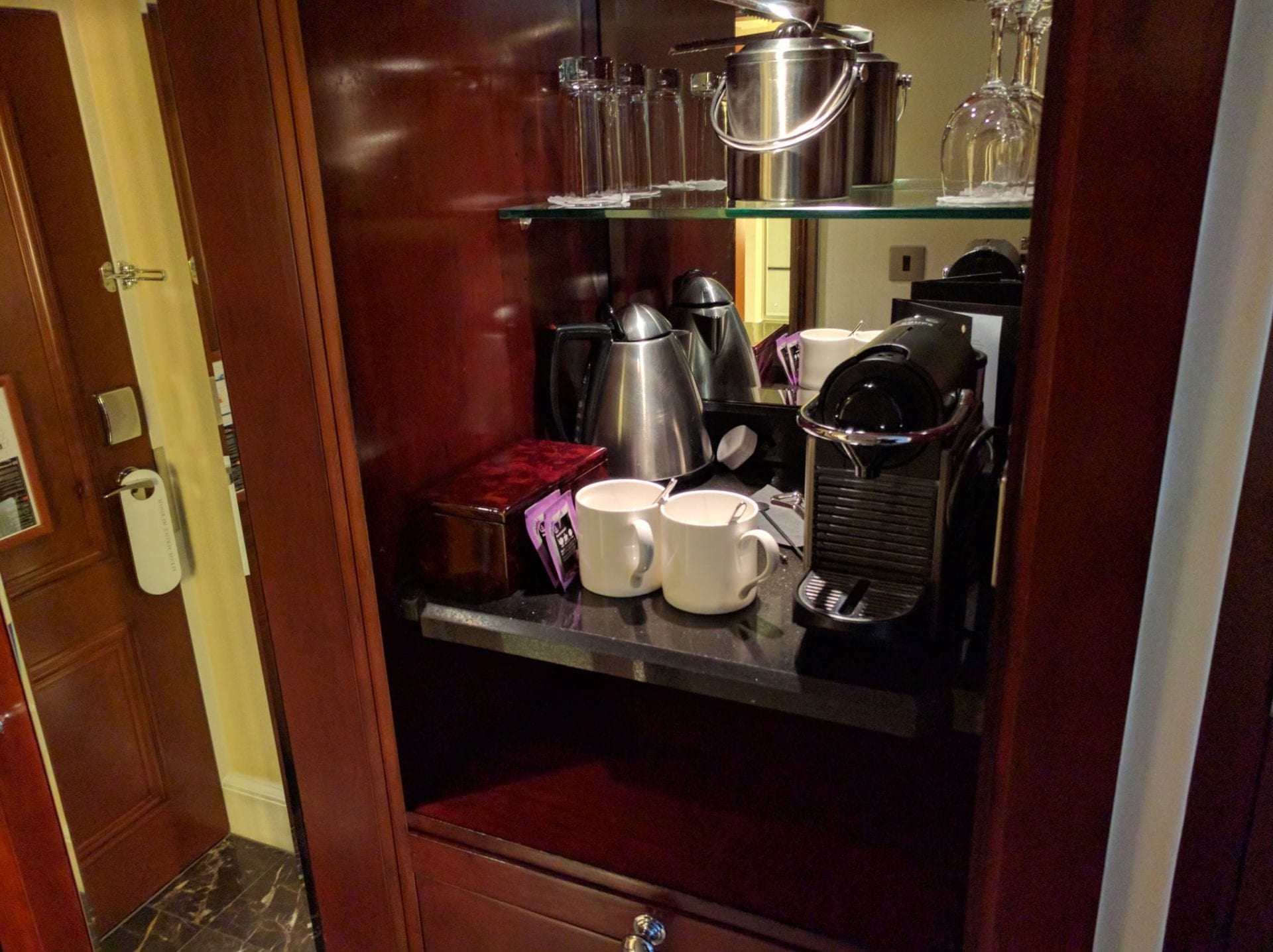Das Mobiliar im Zimmer ist standesgemäß hochwertig ausgeführt, leider teilweise schon mit sichtbaren Abnutzungserscheinungen. Neben dem Bett befindet sich auch ein komfortabler Sessel sowie ein Schreibtisch mit Stuhl im 22 Quadratmeter großen Zimmer. Der Kleiderschrank und die Minibar plus Nespresso Maschine sind platzsparend im Eingangsbereich untergebracht.
