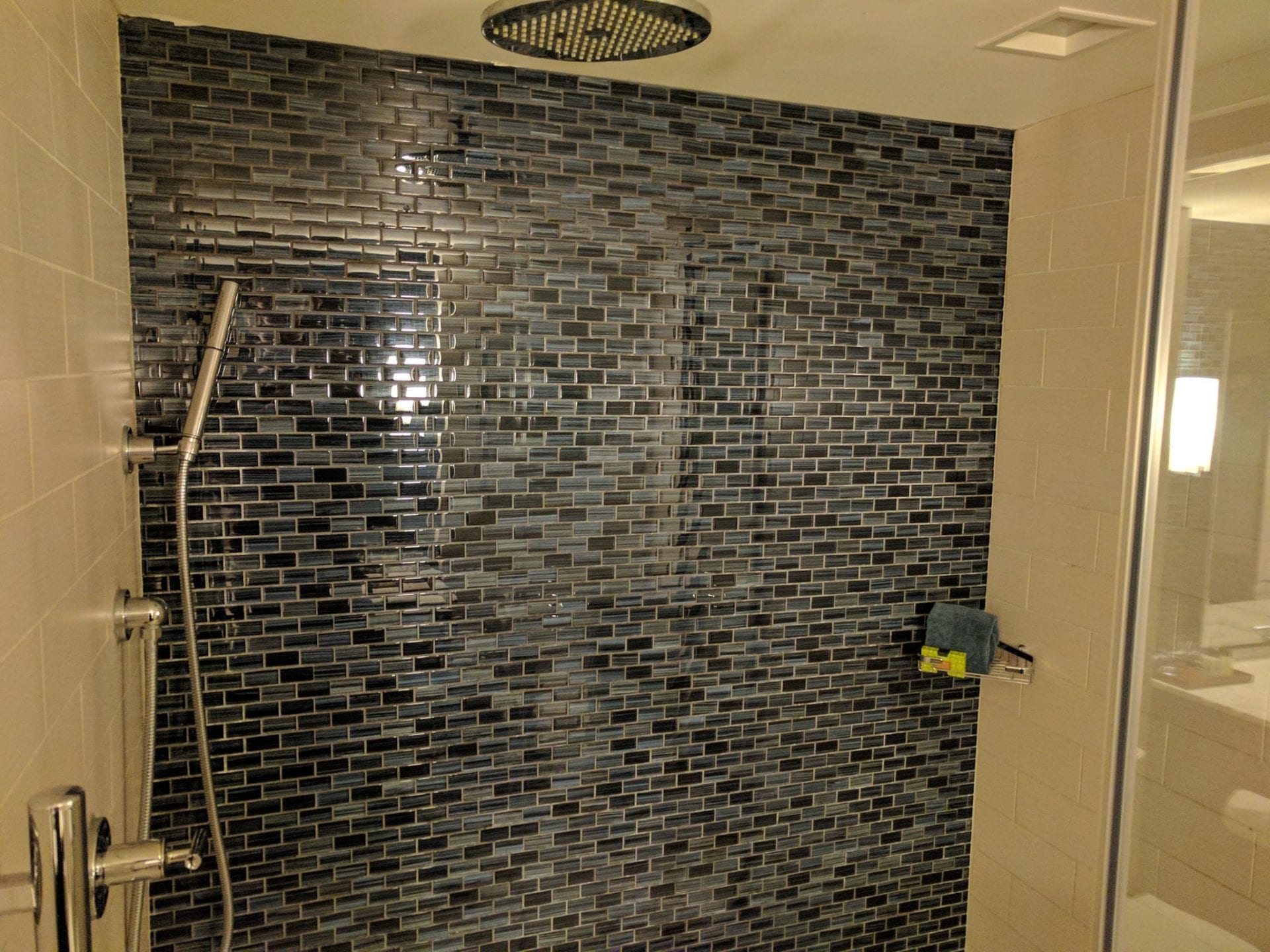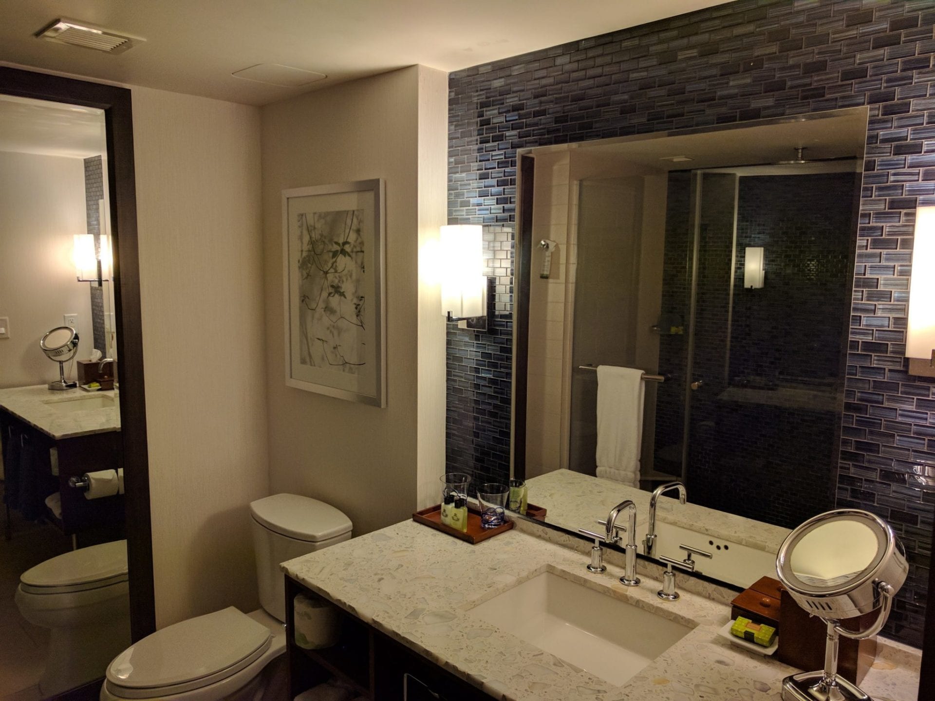 Auch das Badezimmer war sehr schick und bot genügend Platz. Die markentypischen Pflegeprodukte waren ebenfalls in ausreichender Zahl vorhanden und die Dusche war besonders großzügig.