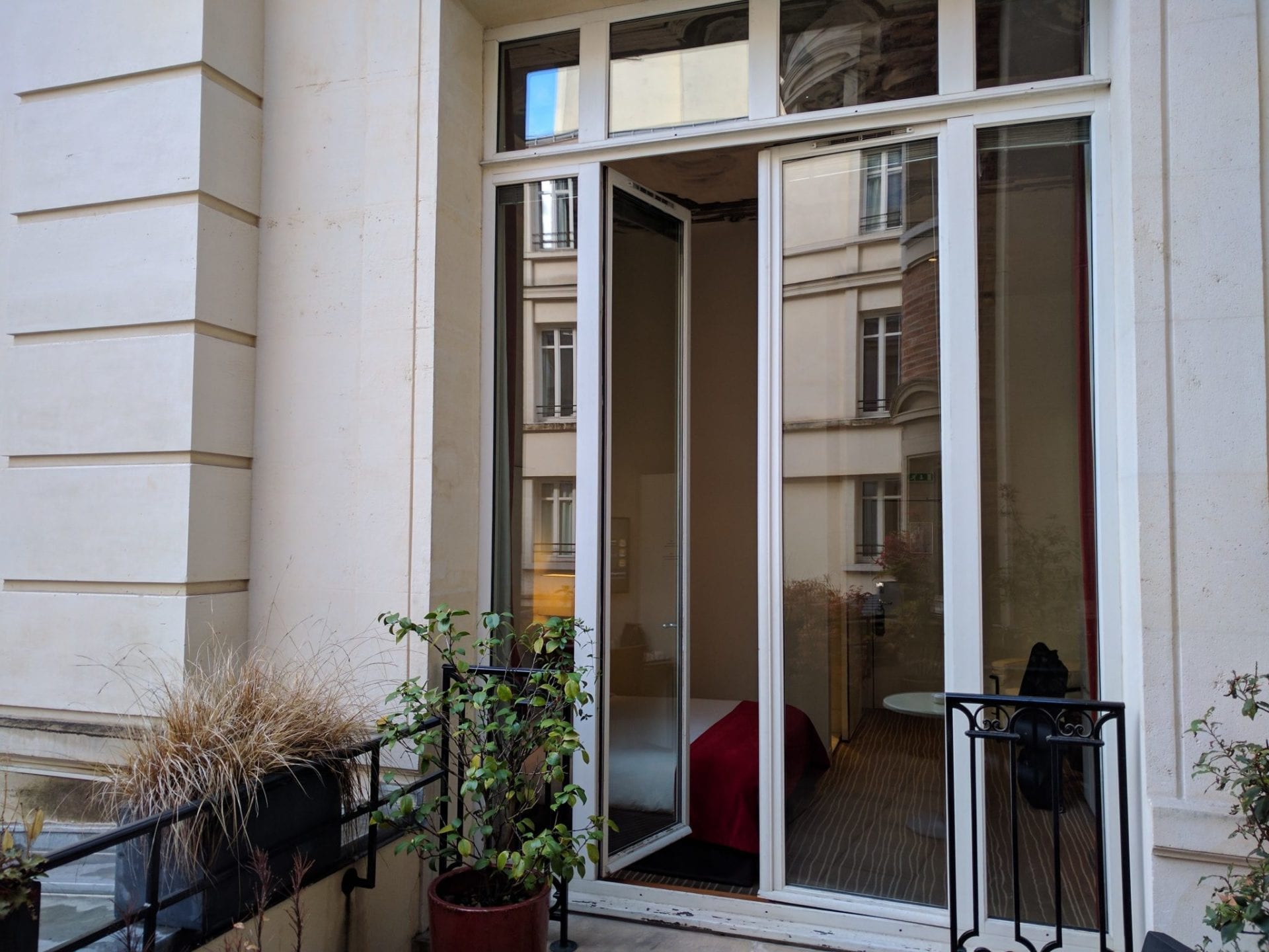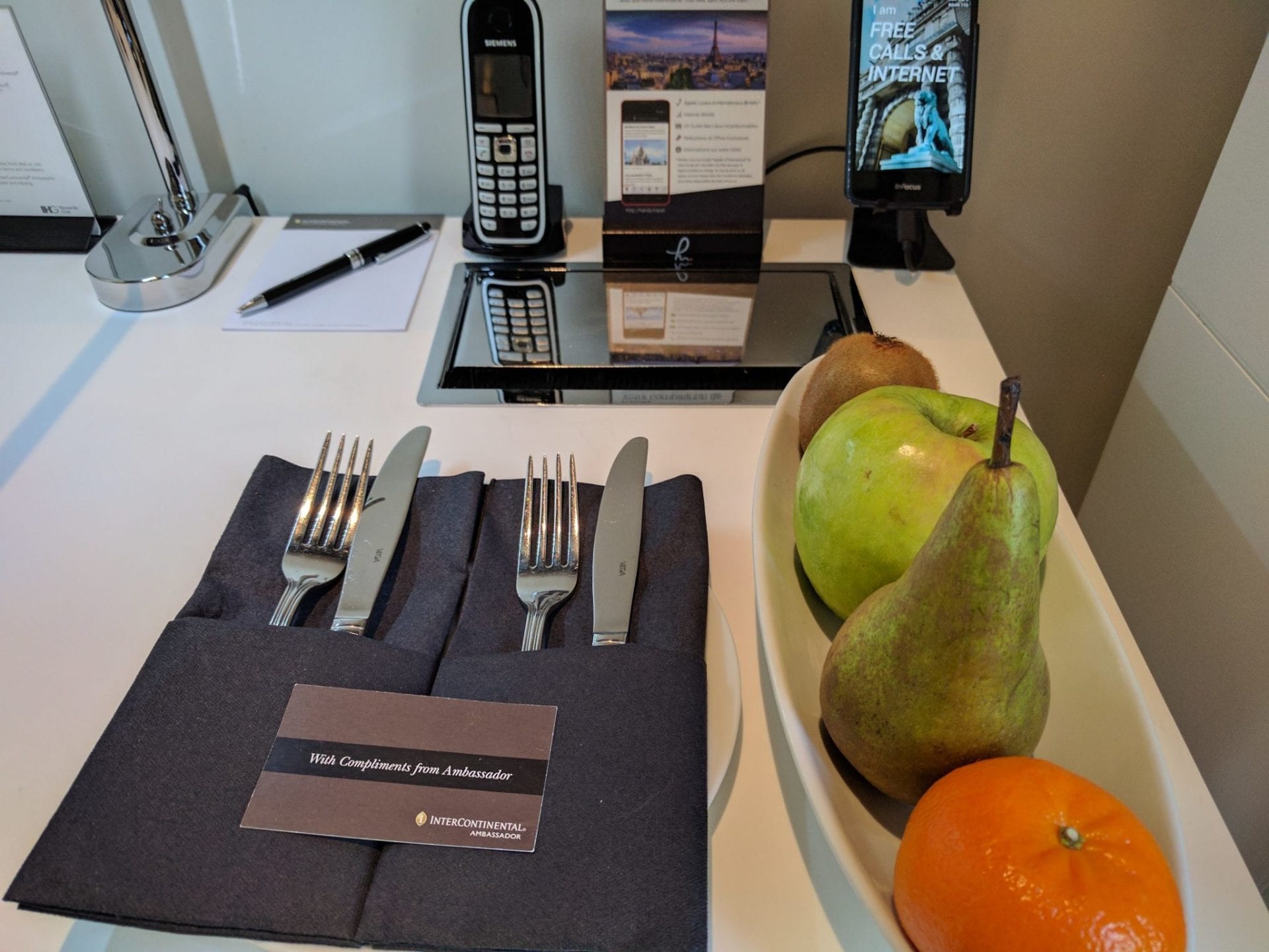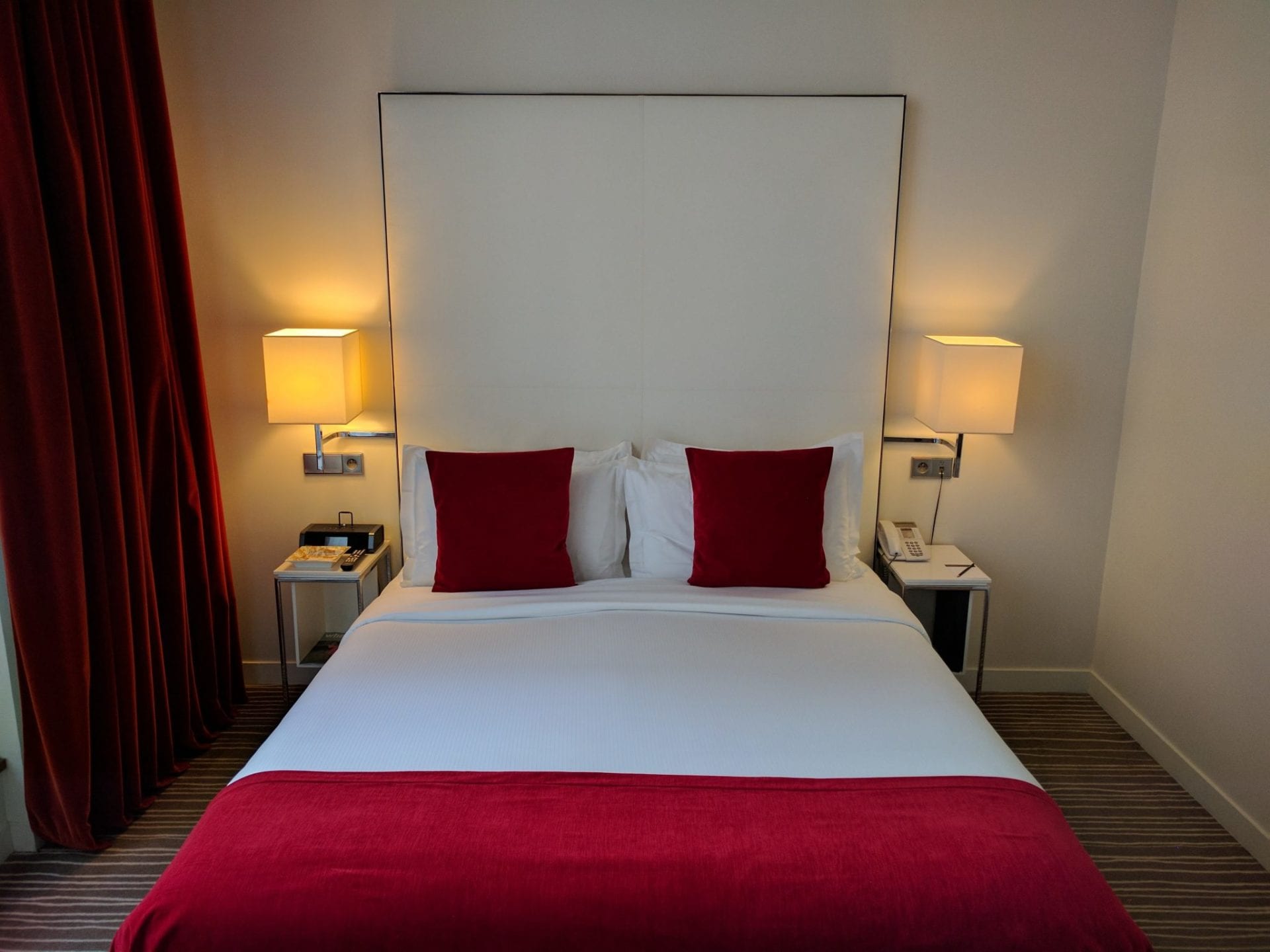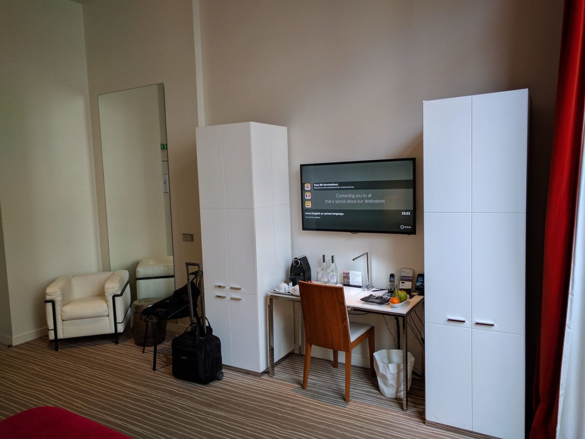 Gebucht hatte ich ursprünglich die Suite im obersten Stockwerk mit Blick auf Paris. Der vorherige Gast hatte allerdings gesundheitliche Probleme und um eine Verlängerung seines Aufenthalts geben, wie mir der General Manager beim Check-in erklärte. Daher wurde ich in einem King Premier Room mit Terrasse untergebracht. Beide Zimmer kosten zwar dasselbe, allerdings hatte ich aufgrund des Ausblicks bewusst die Suite gebucht. Angesichts der Umstände und der Tatsache, dass das Hotel nur eine Suite dieses Typs hat, konnte ich mich aber mit dem King Premier Room anfreunden. Weiterhin wurde mir das Frühstück als Entschädigung kostenfrei angeboten. Zudem brachte man eine Flasche Champagner vorbei und gewährte sämtliche Ambassador Benefits.