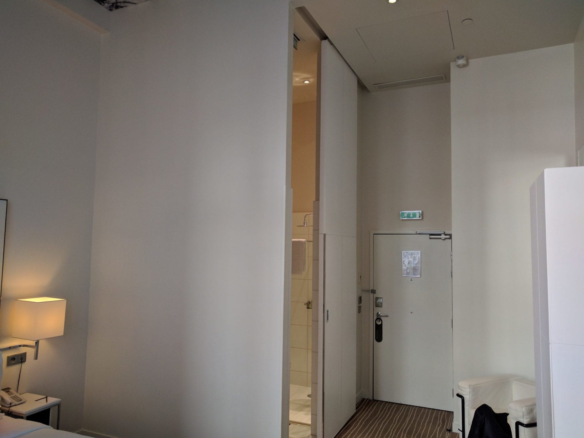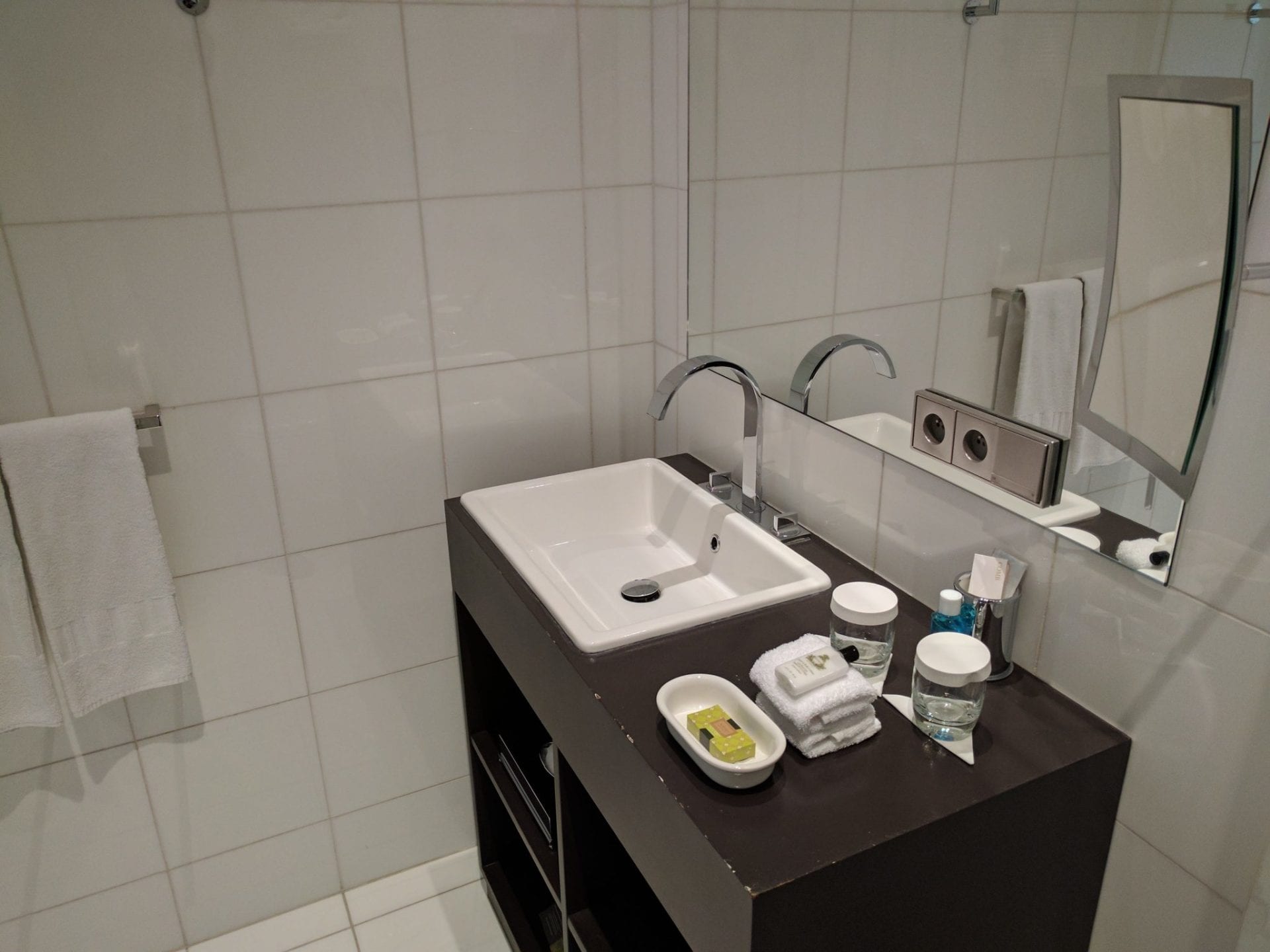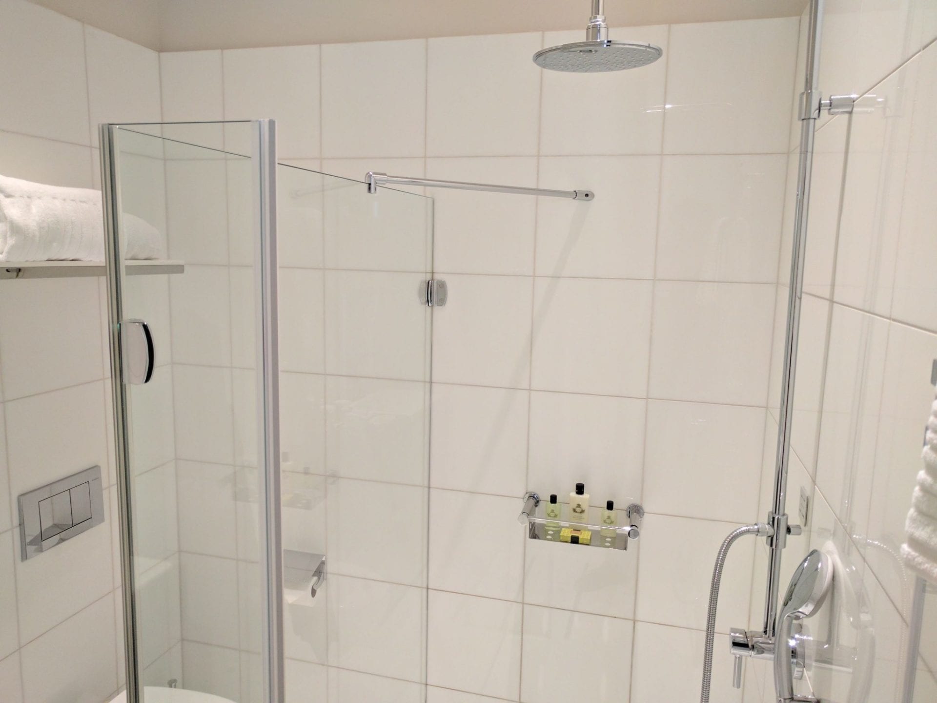Generell begeisterte mich am Zimmer vor allem die hohe Deckenhöhe, die ich auf über vier Meter schätzen würde. Kein Hotelzimmer, in dem ich bereits zu Gast sein durfte, verfügte über solch hohe Decken. Schwachpunkt dieses Zimmers war, wie so oft, das Badezimmer. Hier fehlte es schlicht und ergreifend um Platz. Eine Badewanne sucht man ebenso vergeblich wie ein zweites Waschbecken. Während die Regendusche sehr geräumig ist, fehlt der Platz bei der Toilette. Unschön sind zudem die Abnutzungsspuren am Waschtisch.