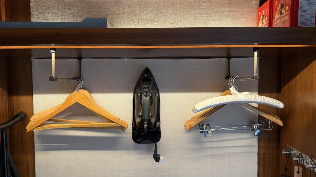 Neben ein wenig Hänge- und Ablagemöglichkeiten findet man hier auch die Hausschuhe sowie den Safe. Leider ist der Platz für Gepäck in den Zimmern allerdings recht limitiert, was gerade mit zwei großen Koffern problematisch werden kann.