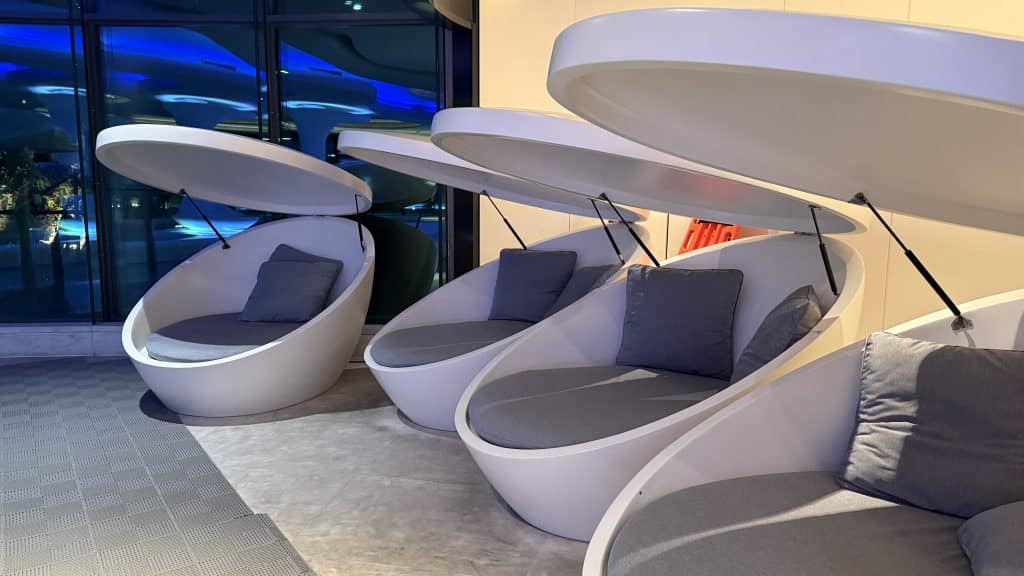 Diese sind zwar bequem und auch gut für zwei Personen geeignet. Sobald man sich niedergelassen hat, fragt man sich jedoch, wo es eigentlich ein Handtuch gibt – dafür muss man dann zurück ins Fitnesscenter und mit Händen und Füßen den Mitarbeiter fragen.